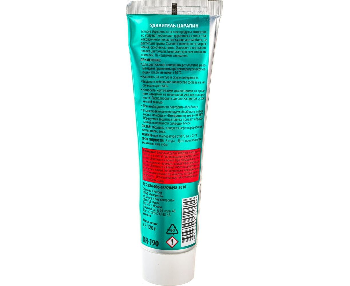 Удалитель царапин KERRY 120 мл 11604713 бережно удаляет небольшие царапины и сколы, убирает потускнения с лакокрасочного покрытия. Восстанавливает цвет эмали, возвращает потускневшему лакокрасочному покрытию сияющий блеск. Мягкие абразивы в составе продукта эффективно убирают небольшие царапины и сколы с лакокрасочного покрытия кузова автомобиля, не достигшие грунта. Удаляет с поверхности загрязнения, окисления, пятна. Не содержит силиконы. Безопасен для всех типов автоэмалей.