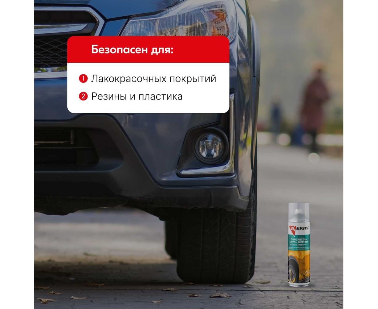 Очиститель пятен битума и следов насекомых KERRY аэрозоль, 335 мл 11604723 эффективно удаляет пятна битума, смолы деревьев, следы насекомых и тополиных почек с кузова автомобиля, стекол, фар, решетки радиатора, бампера и хромированных деталей. Может быть использован для удаления антикоррозийных средств. Не вредит лакокрасочным покрытиям, резиновым и пластиковым деталям.