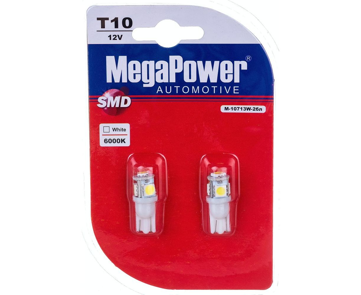 Автолампа MEGAPOWER T10W W2.1x9.5d 4 SMD 5050 WHITE блистер 2 шт 6000K 80лм 12V 1 50 10713 - источник освещения для установки на автомобиль. Модель отличается эффективной светоотдачей.