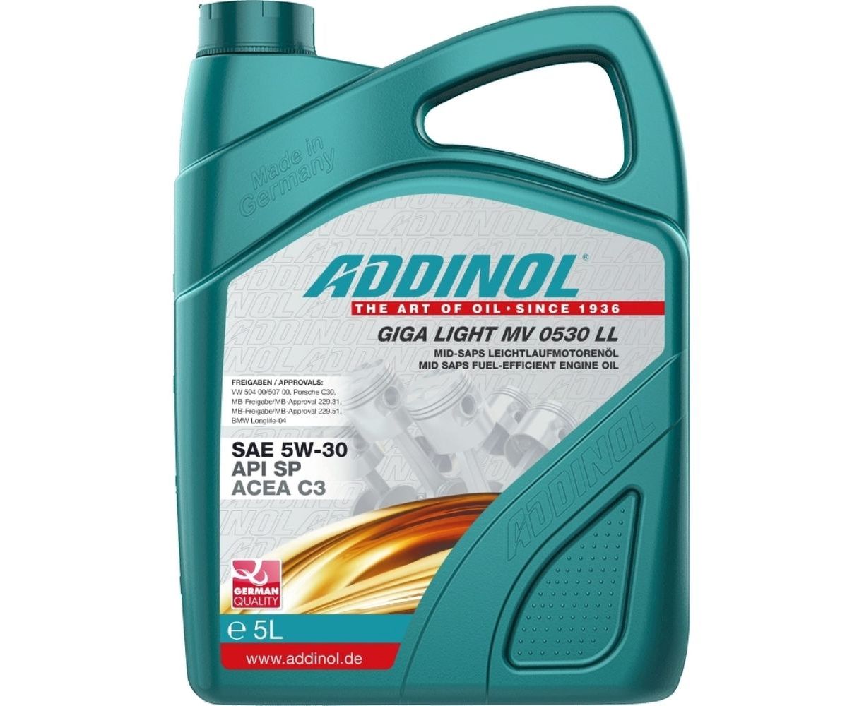 Моторное масло Addinol Giga Light MV 0530 LL — высокомощное инновационное моторное масло класса SAE 5W-30 с ресурсосберегающими свойствами. Оптимальное сочетание самой современной технологии синтеза и среднезольных (mid SAPS) присадок гарантирует исключительную мощность со свойствами Longlife III.
