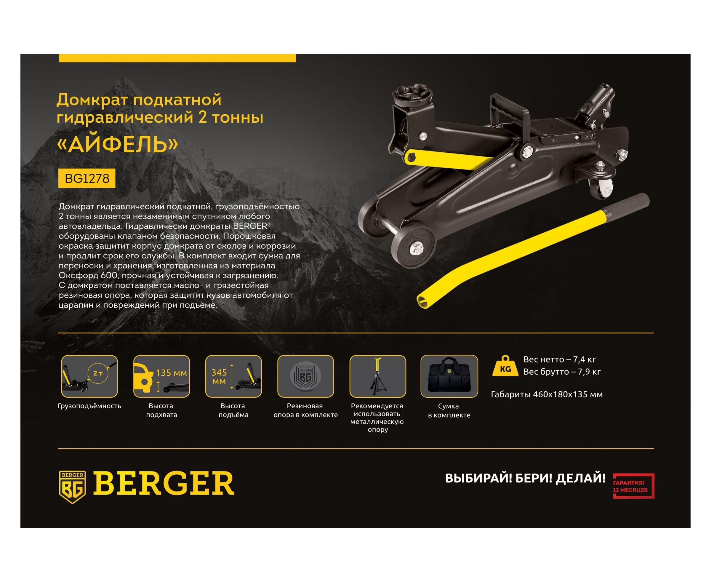 Подкатной гидравлический домкрат Berger BG 2т. АЙФЕЛЬ 135-345 мм, сумка для хранения, BG1278