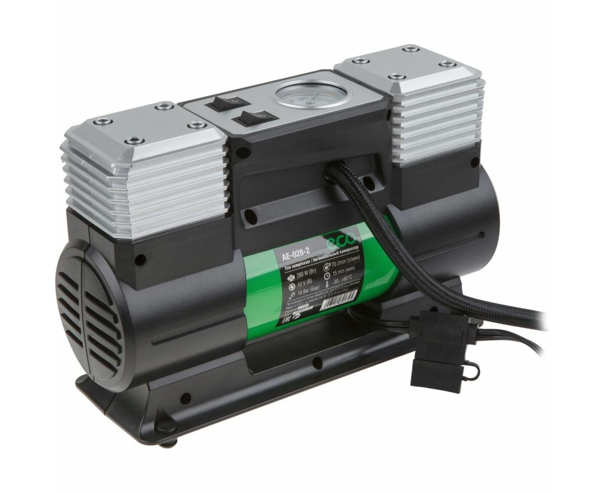 Автомобильный компрессор ECO AE-028-2 - двухцилиндровый производительный насос. Мощный двигатель со 100% медной обмоткой и большим статором обеспечивает гарантированно высокий ресурс устройства и быстроту работы.
