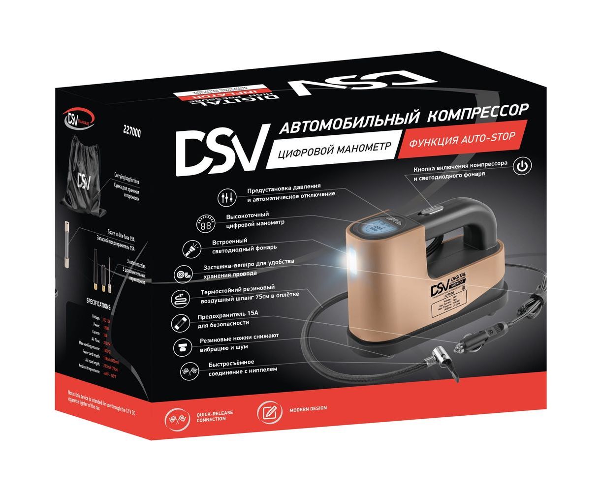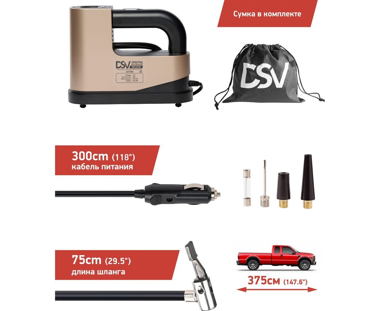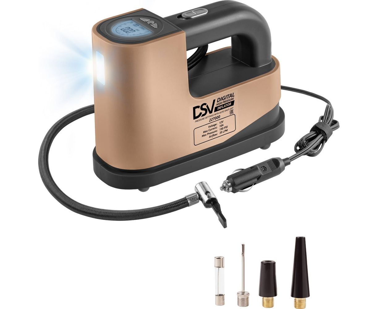 Цифровой компрессор с автостопом DSV 35 л/мин, LED фонарь, сумка 227000, оснащенный набором переходных штуцеров, может использоваться для накачивания шин автомобилей и другого транспорта, различных надувных изделий, спортивного инвентаря. Производительность показателя 35 л/мин обеспечивает высокую скорость накачивания. Цифровой манометр с точностью измеряет текущее давление и помогает выполнять визуальный контроль в режиме реального времени.