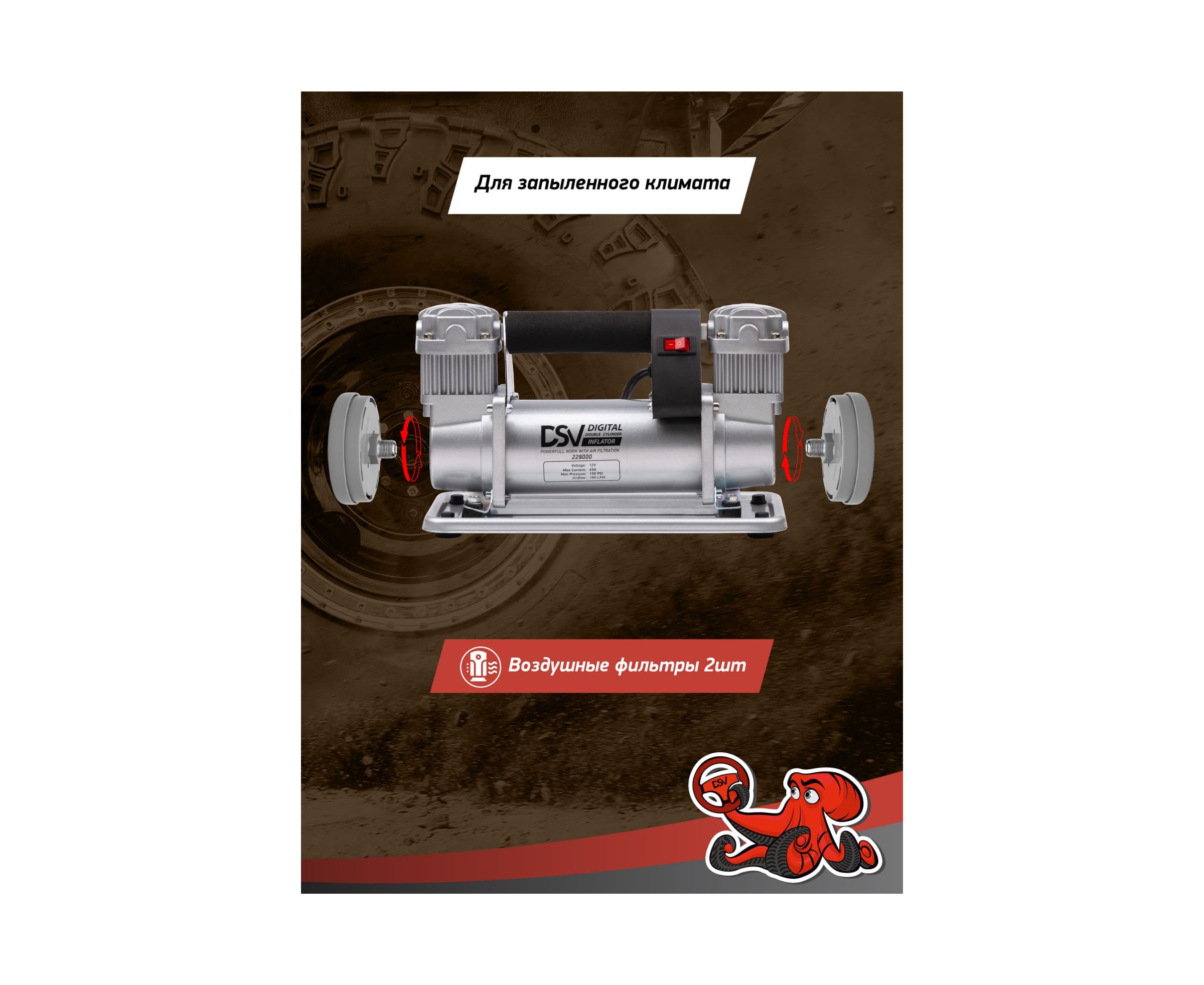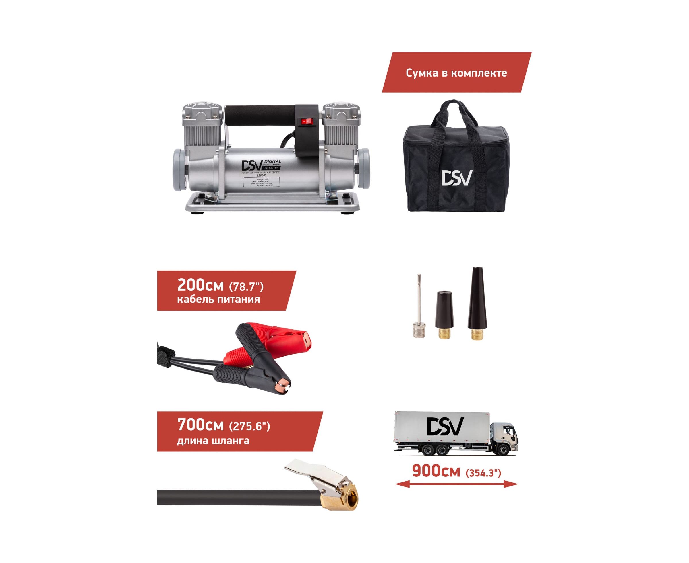 Компрессор DSV HEAVY с воздушными фильтрами, 160л/мин, сумка, 228000 - экстрамощное устройство с максимальной производительностью 160л/мин. Данная модель автомобильного двухцилиндрового компрессора поставляется в заводской упаковке, имеет ряд очевидных преимуществ: быстросъемный воздушный шланг 700см с манометром, реле контроля напряжения, прорезиненные коннекторы к АКБ, застежка-велкро для удобства хранения провода, мягкая ручка-держатель, два воздушных фильтра, защищающие компрессор от чрезмерного износа в условиях запыленности. На обратной стороне манометра присутствует кнопка-дефлятор для спуска давления колеса. Она позволяет регулировать давление в случае перекачки.