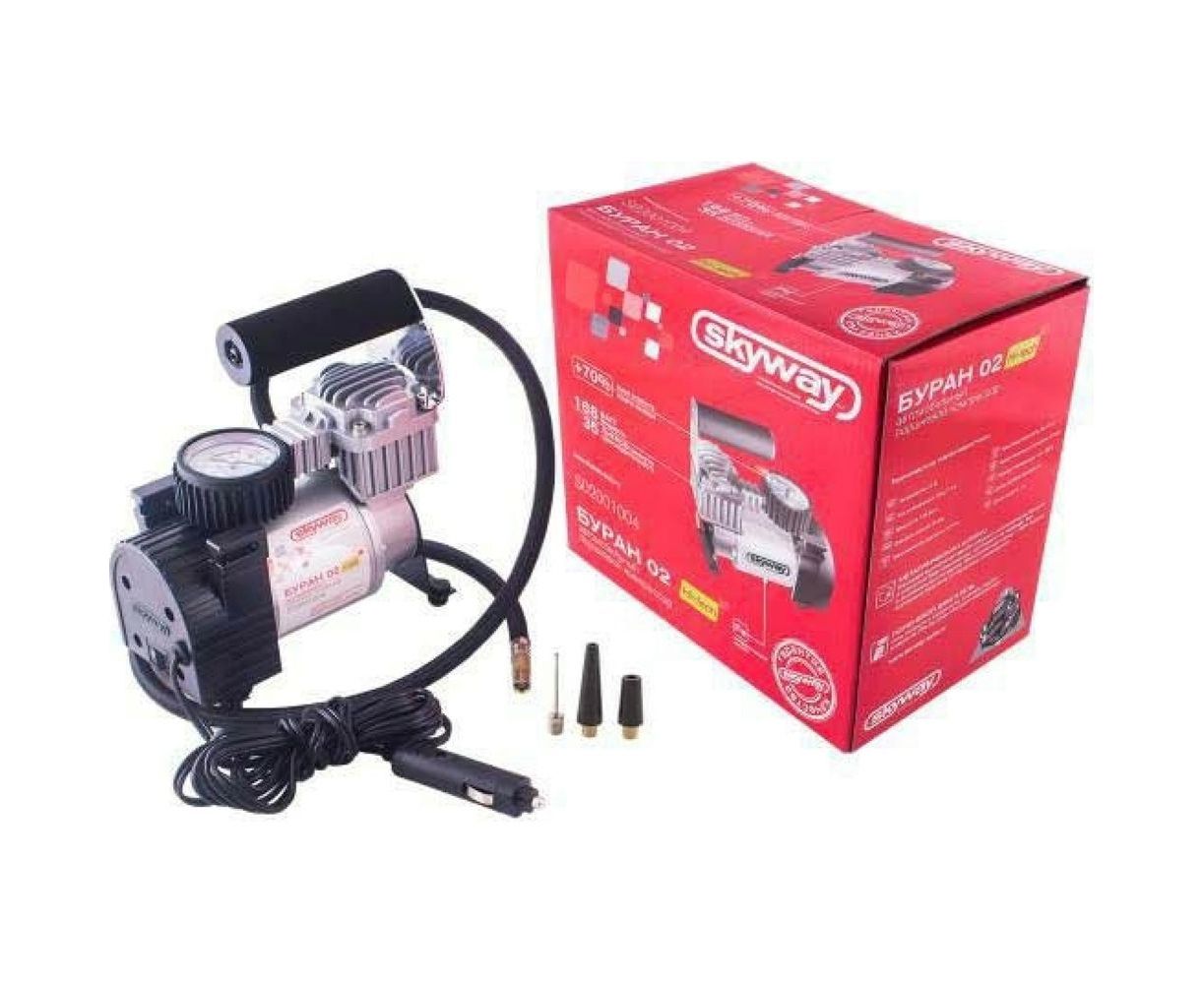 Металлический компрессор 45л/мин в прикуриватель Hi-tech Сумка, 7атм SKYWAY БУРАН-02 S02001004 представляет собой удобное оборудование, которое необходимо перевозить в автомобиле. Дополнительные насадки расширяют стандартный комплект.