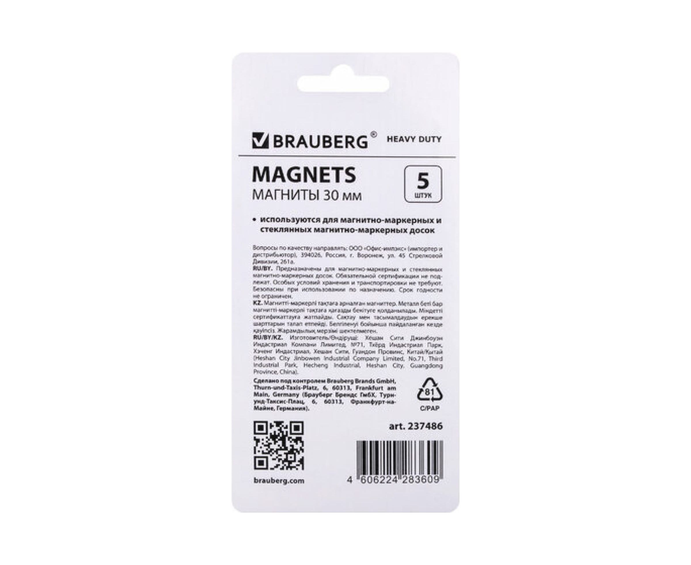 Супермощные неодимовые магниты BRAUBERG HEAVY DUTY 30 мм, набор 5 шт., серые 237486 используются для магнитно-маркерных и стеклянных магнитно-маркерных досок. Благодаря большой силе удерживают до 6 раз больше листов бумаги на магнитной поверхности. Магниты круглой формы стандартного диаметра — 30 мм, но с повышенной магнитной силой. Цвет — серый. Изготовлены из пластика. Упакованы в удобную и надежную блистерную упаковку с европодвесом.