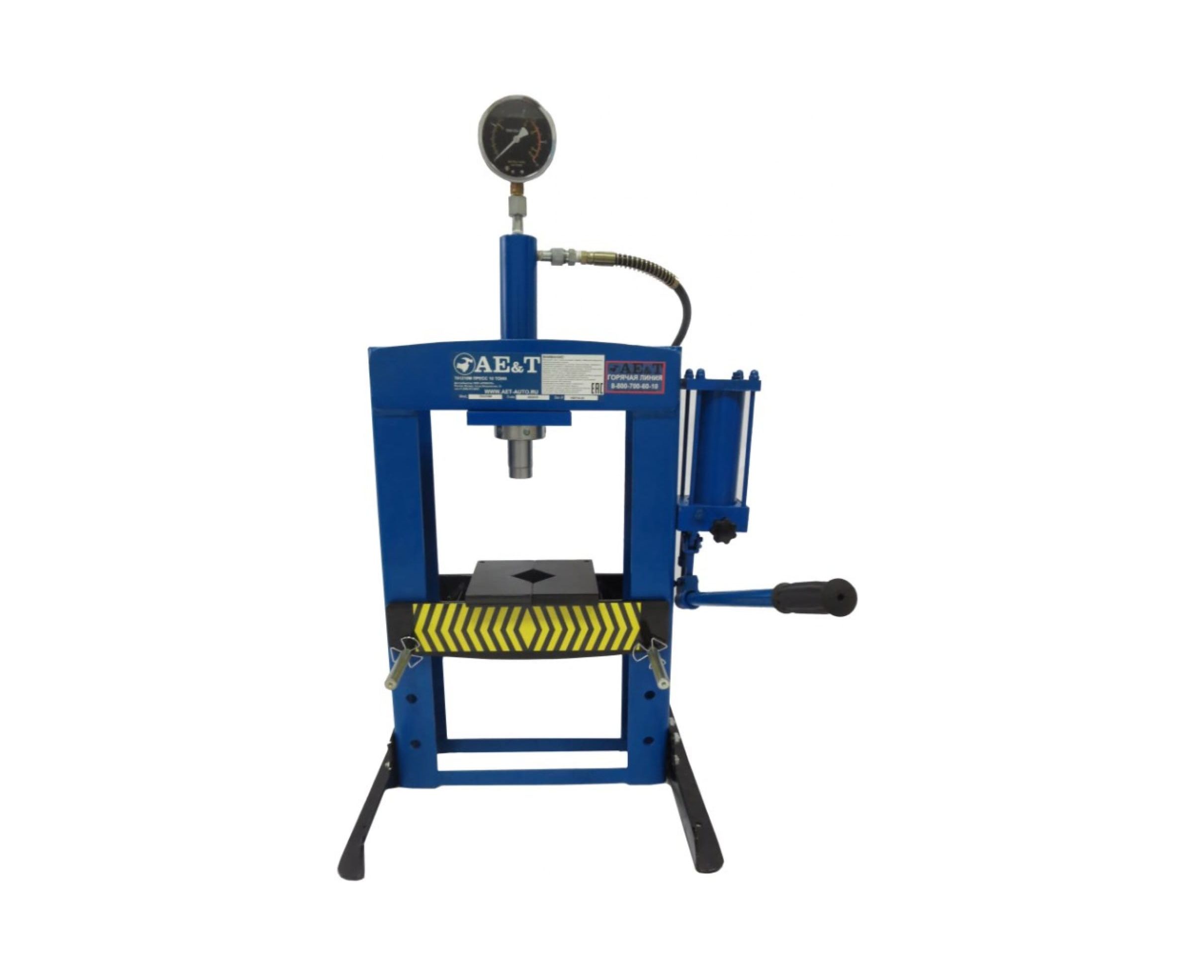 Пресс AE&T Т61210М применяется для ремонта и монтажа автомобильных элементов. Модель устанавливается на стол или верстак и закрепляется анкерными болтами. Гидропривод обеспечивает значительное усилие прижима с минимальной затратой физических сил оператора. Допускается перемещение цилиндра по раме на 140 мм влево или вправо относительно центра, что расширяет возможности применения пресса. Ход штока составляет 180 мм.