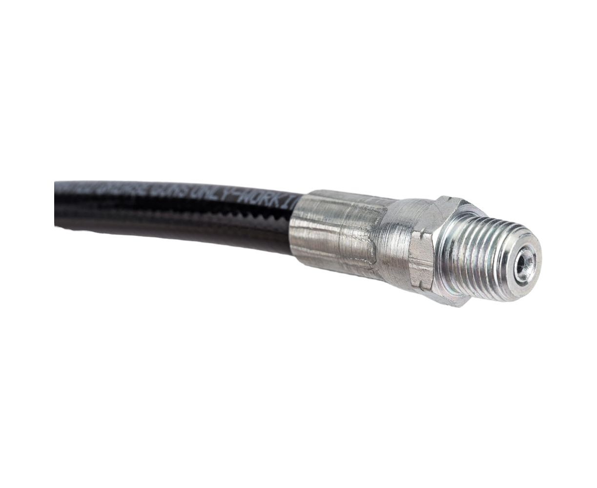 Шланг для смазки с защитной пружиной 300 мм х 1/8" BSPT. Рабочее давление 240 бар. Давление разрыва 800 бар. Пружина предотвращает перегиб и излом шланга