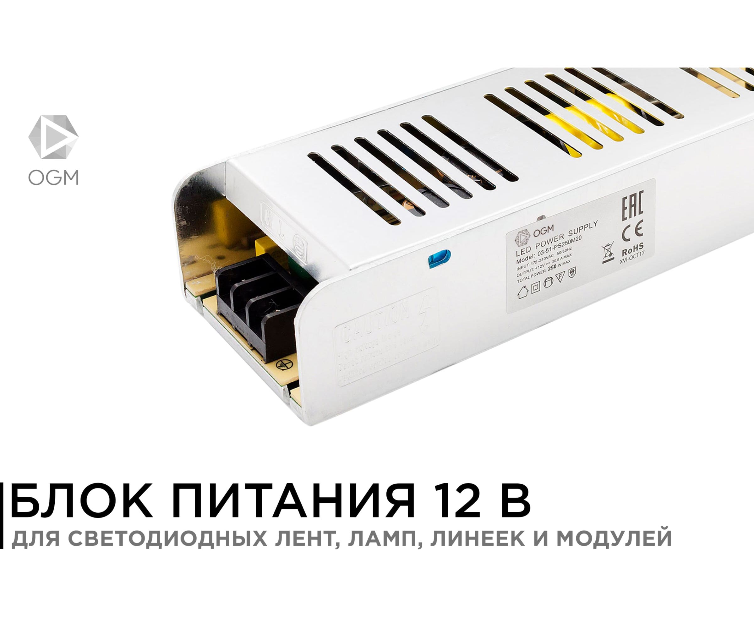 Блок питания OGM слим-метал 12В, 250 Вт, IP20, 20,83 А, 223х68х40 мм/PS3-51