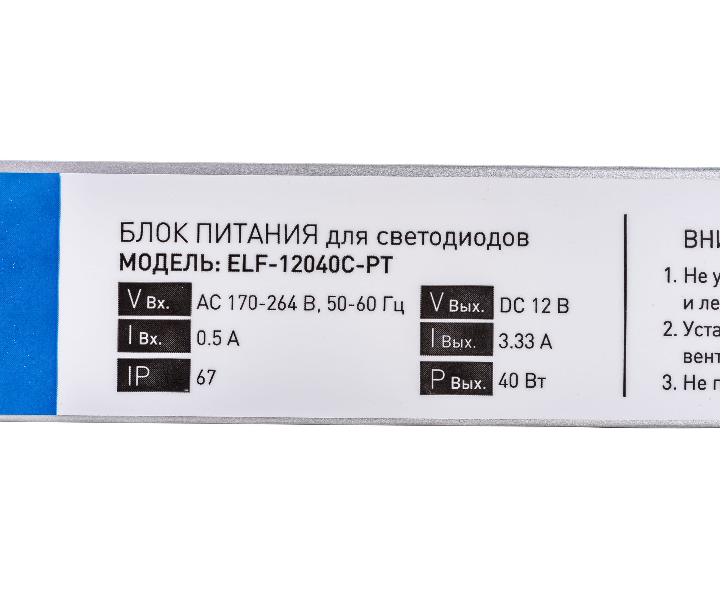 Герметичный компактный блок питания ELF 12В, 40Вт, металл, IP67 ELF-12040С-PT предназначен для обеспечения общего или раздельного питания светодиодного светотехнического оборудования постоянным током требуемого напряжения 12 В от сети переменного тока.