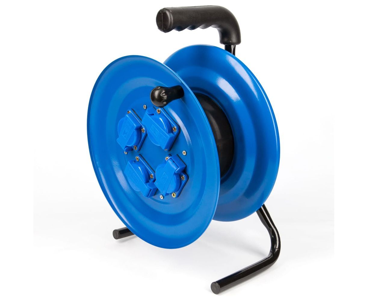 На корпусе катушки располагается устойчивая подставка и специальная рукоятка для удобства переноски удлинителя. Катушка без удлинителя, диаметр 30 см, 4 розетки с заземлением, металлическая катушка без провода, металлическая тренога, IP-44 Длина провода с сечением 3х2,5 составит ±50 м.