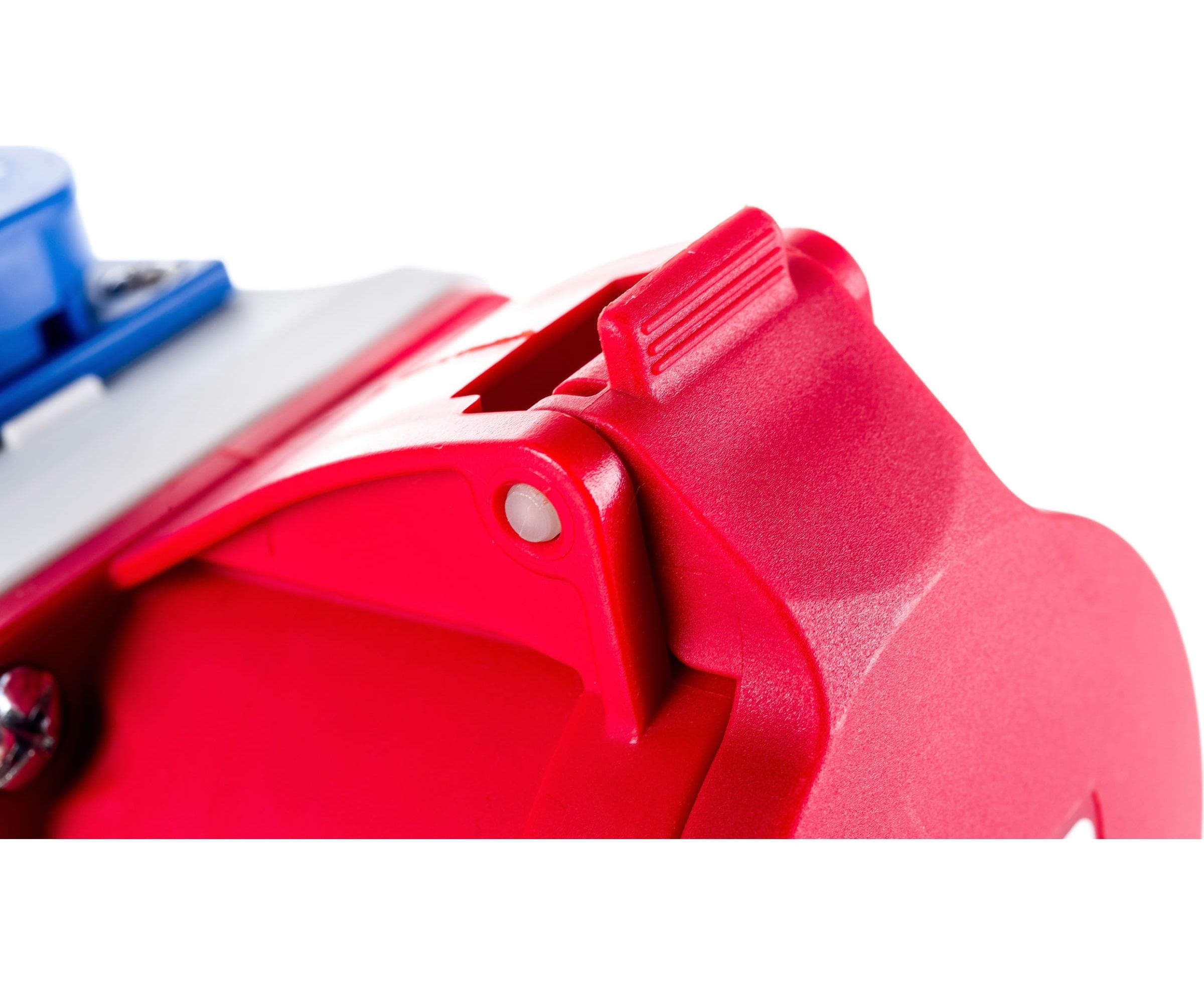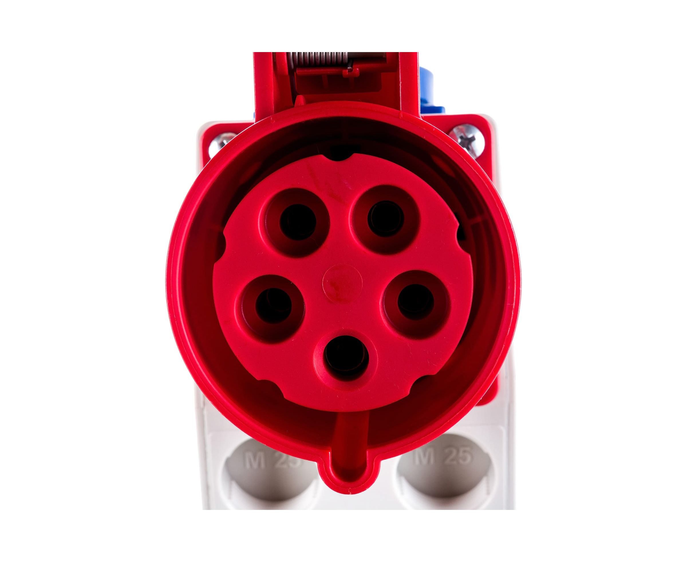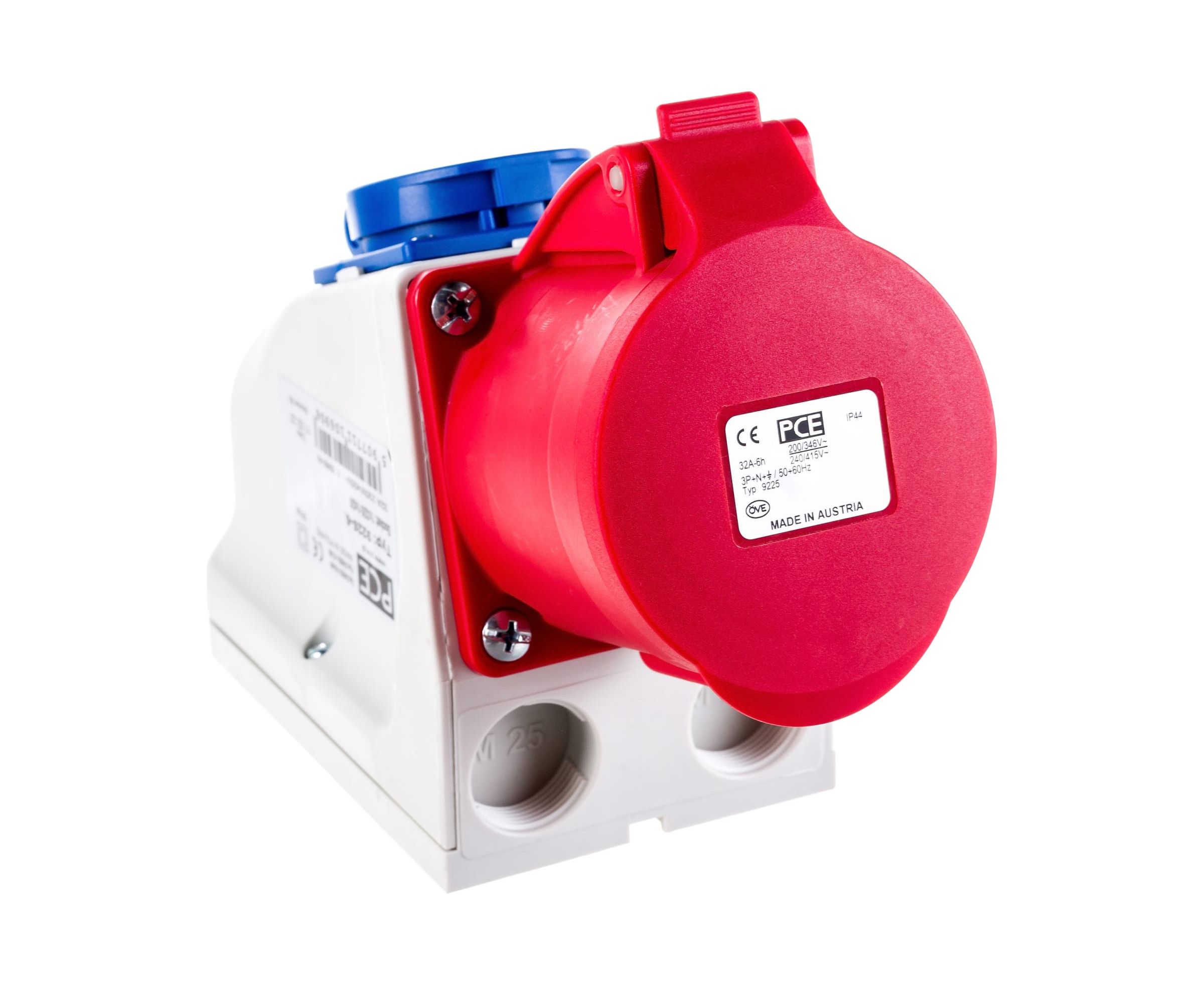 Настенная комбинированная розетка PCE 32А 400V 3P+N+E IP44 9225-6 обеспечивает возможность одновременного подключения трехфазной 380v пятиконтактной 32а и однофазной вилки 220 евро стандарта.
