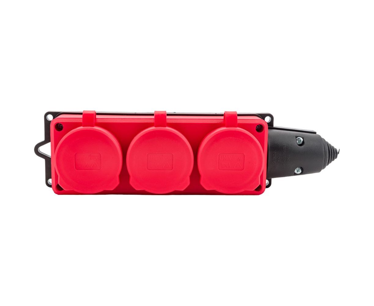 3-х местная однофазная колодка UNIVersal с заглушками компакт c заземлением каучук 16А 250В ip44 цвет красный еврослот 3073