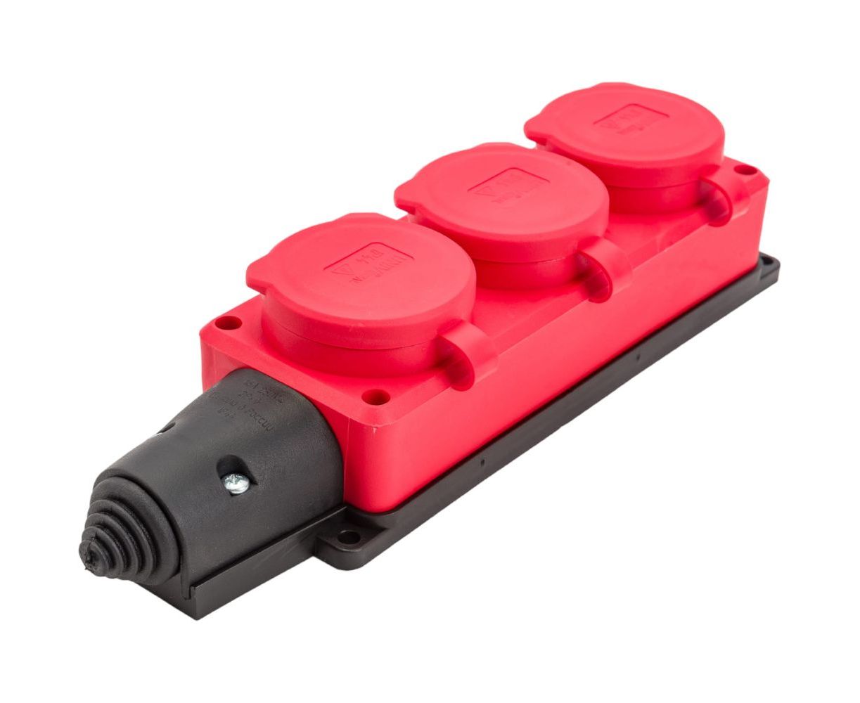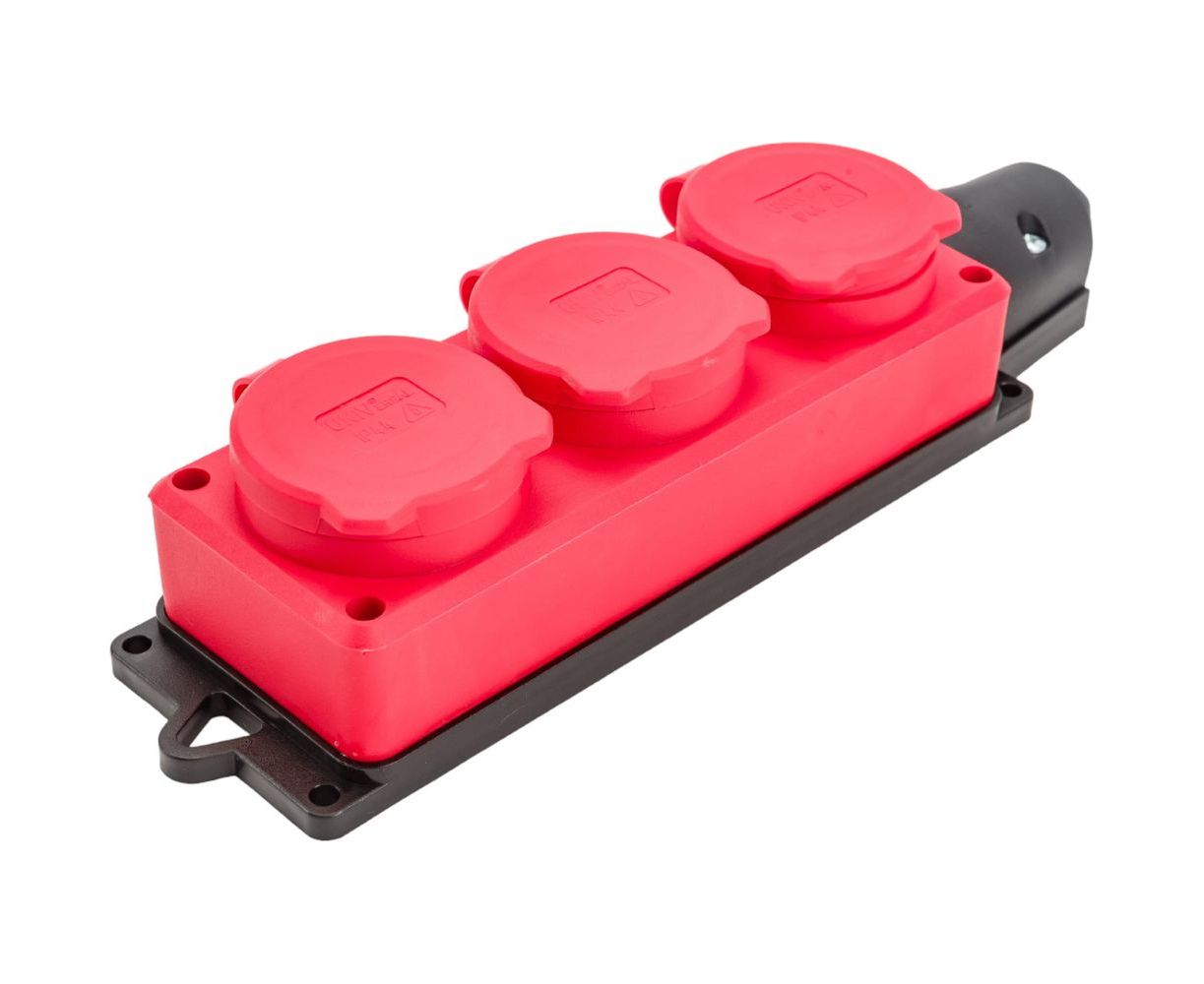 3-х местная однофазная колодка UNIVersal с заглушками компакт c заземлением каучук 16А 250В ip44 цвет красный еврослот 3073 может использоваться для производства удлинителей, а также, благодаря наличию крепежных отверстий на задней крышке корпуса, в качестве блока розеток для открытой установки внутри и снаружи производственных помещений.