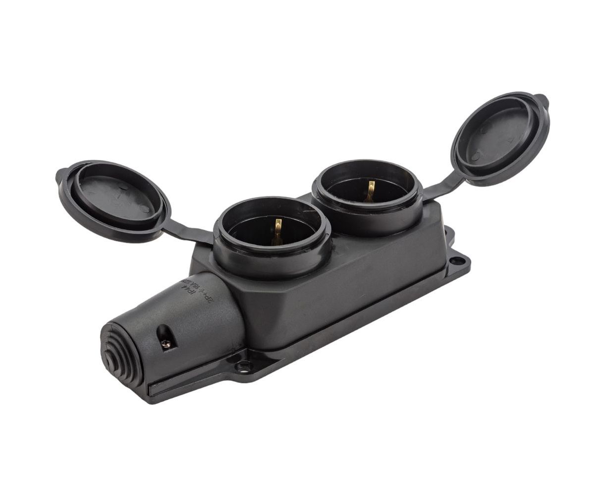 Двухместный розеточный блок АБК-СИЛА с крышками каучук 16А 220В IP- 44 2903031 применяется для подключения различного электрооборудования или электроинструмента. Корпус изделия изготовлен из каучука, что позволяет использовать его в сложных погодных и эксплуатационных условиях. Подходит для применения на строительных площадках, в машиностроении, на производстве или в быту. Для защиты рук от соскальзывания при разъединении розетки и вилки на корпусе имеются специальные ребра. Крышки розеток надёжно соединены с блоком и обеспечивают хорошую защиту от пыли и влаги.