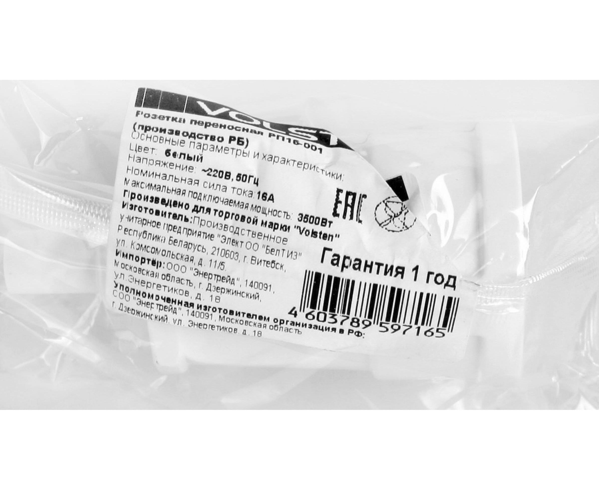 Разборная розетка Volsten Sb1-M11 16А белая без заземления 1 гнездо Модель РА16-001 14445