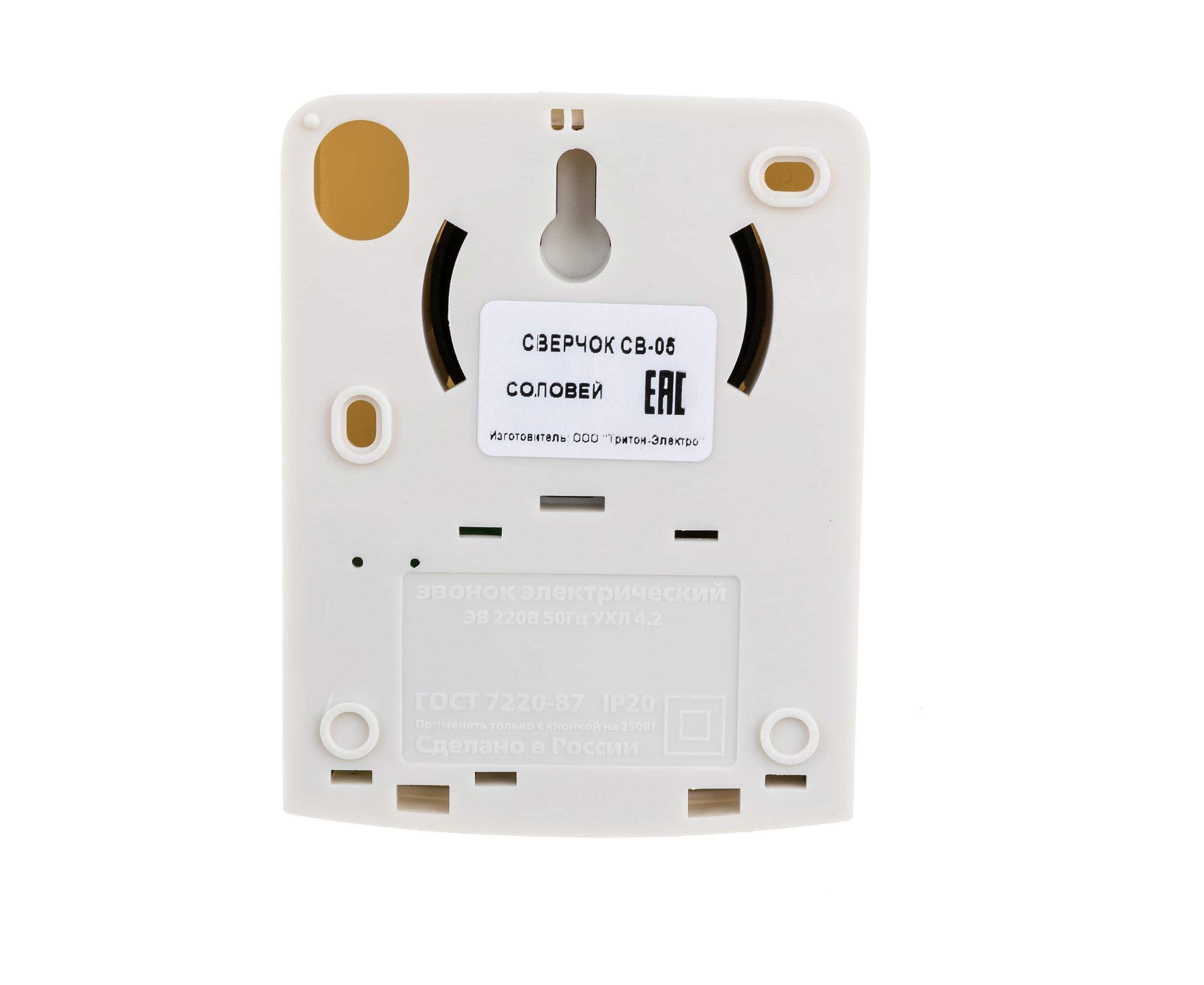 Проводной звонок Тритон Сверчок соловей СВ-05 отличается высоким качеством и предназначен для подачи звукового сигнала в жилых, служебных и общественных помещениях. Звонок имеет внутренний блок зажимов для внешних проводов. Подсоединение к электросети - стандартное. Материал корпуса - АБС-пластик. Звучание – электронное пение соловья длительностью 3-4 сек.