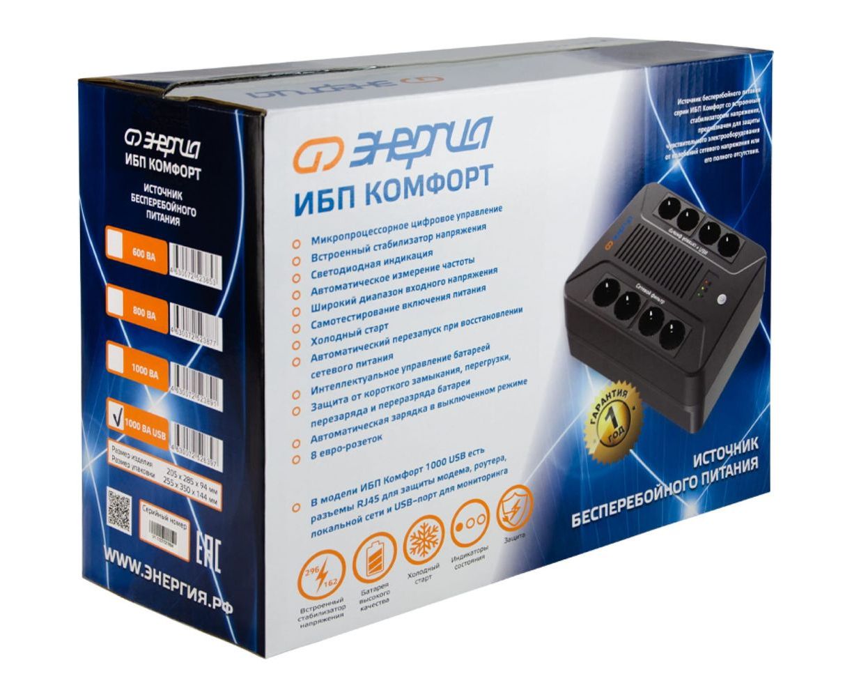 Источник бесперебойного питания Энергия комфорт 1000 usb Е0201-1003 предназначен для защиты персональных компьютеров, аудио–видеоаппаратуры, офисной техники и другого оборудования небольшой мощности.