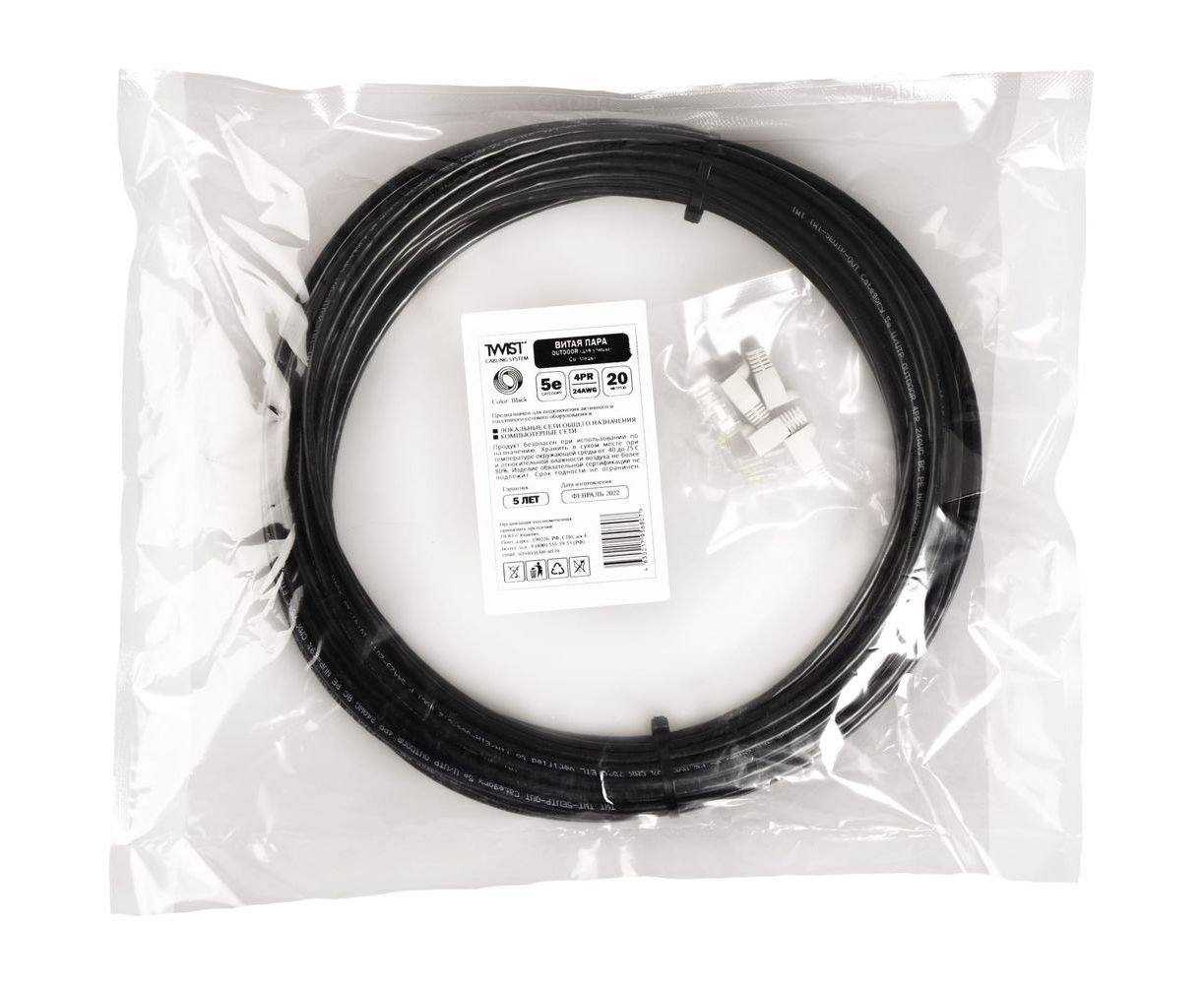 Кабель витая пара TWIST 20м, U/UTP, 4PR, cat. 5e, Cu, PE, 24 AWG, outdoor TWT-5EUTP-OUT/20 предназначен для наружных работ на улице или снаружи помещений (outdoor). Цельные жилы (solid) из бескислородной электротехнической меди диаметром 0,52 мм обеспечивают полосу пропускания 100 МГц и соответствие кабеля современным телекоммуникационным стандартам.