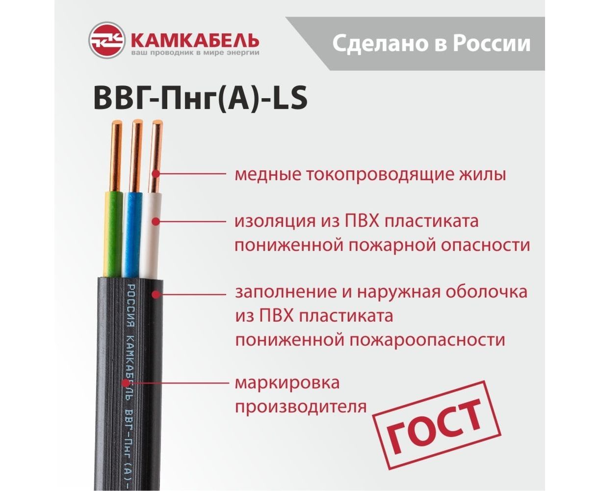 Кабель ВВГ-ПНГ А - LS Камкабель 3x2.5 мм 20м 1157К30HG00070А0020М предназначен для передачи и распределения электрической энергии в стационарных установках на номинальное переменное напряжение 0,66 кВ и 1,0 кВ частоты 50 Гц или на постоянное напряжение в 2,4 раза больше переменного напряжения. Подходит для эксплуатации на суше, реках и озерах на высотах до 4300 м над уровнем моря.