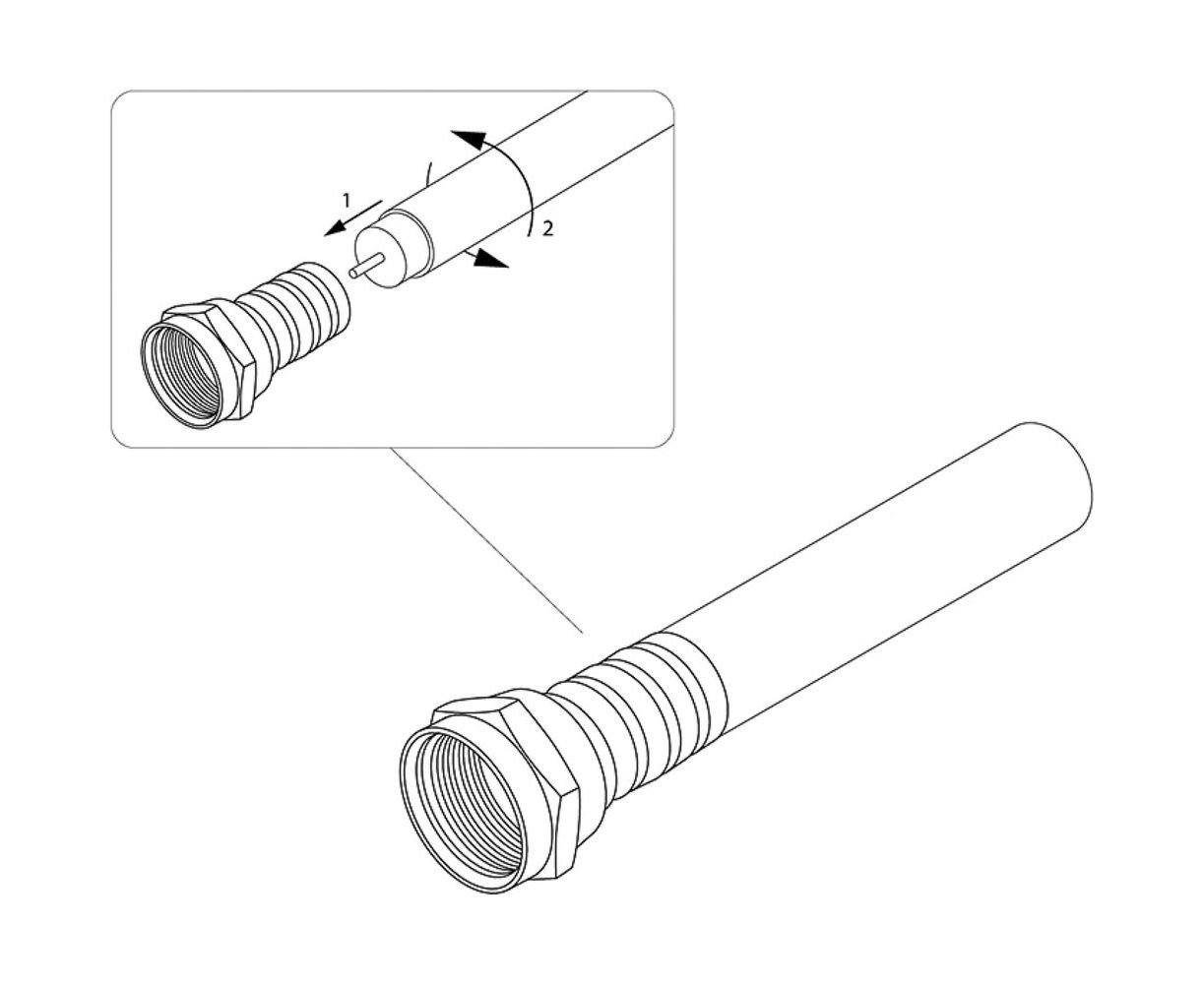 Разъем данного вида не имеет собственного штекера, его роль выполняет центральная жила кабеля: это позволяет избежать дополнительных потерь сигнала. F-коннектор изготовлен из никелированного сплава меди (биметалл). Разъем RG-6 устанавливается вручную методом накрутки гильзы разъема на внешнюю оболочку кабеля после соответствующей зачистки контактов.