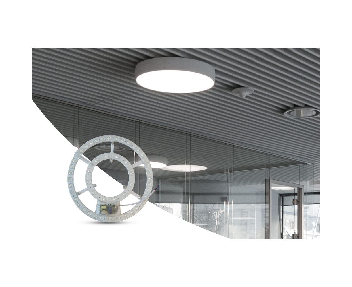 Светодиодный модуль имеет круглую форму с диаметром 307 мм и толщиной драйвера 27 мм. Данное изделие работает от напряжения 230 В и не требует дополнительных устройств для подключения. Благодаря отсутствию пульсации подходит для использования в жилых помещениях, а также административных, медицинских, производственных и образовательных учреждениях. Площадь освещения 28-32 м².