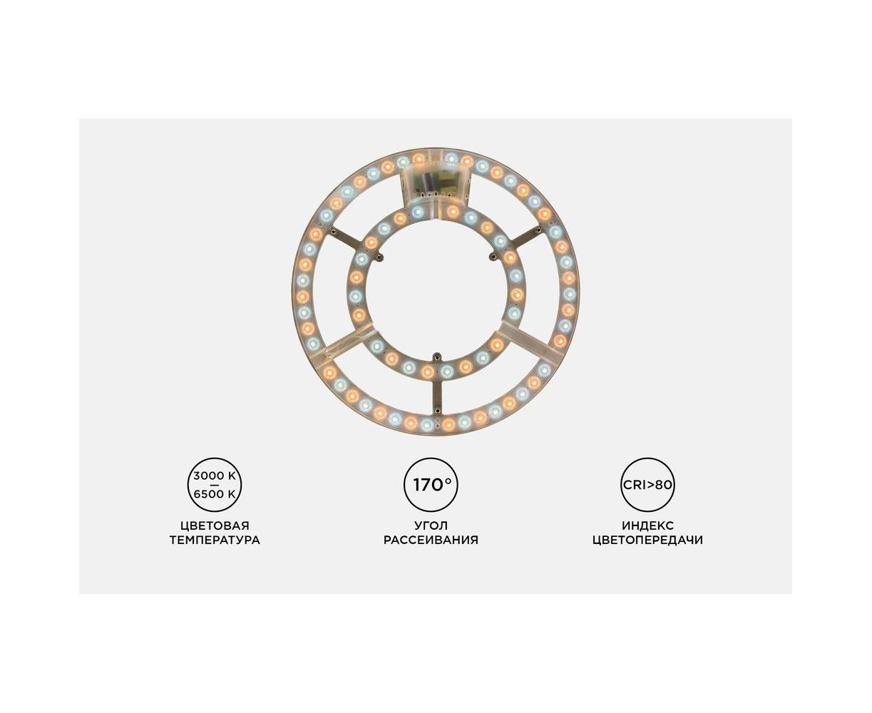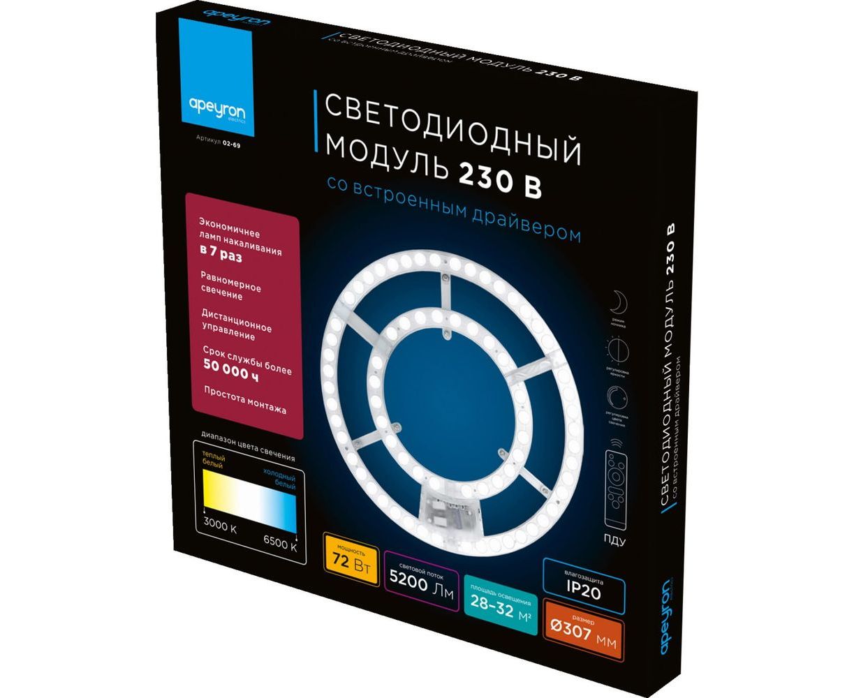 Светодиодный модуль со встроенным драйвером Apeyron 230В, 72Вт, smd2835, 5200Лм, 3000-6500К, круглая, с пультом 02-69 предназначен для замены стандартных ламп, а также современных светодиодных источников свечения, которые уже повсеместно используются в настенно-потолочных светильниках. Благодаря конструкции этого модуля плафон светильника будет светиться на все 100%. Благодаря большей площади охлаждения срок службы будет в разы больше.У данного изделия световой поток равен 5200 лм, что является эквивалентом 5-ти ламп накаливания мощностью по 110 Вт каждая.
