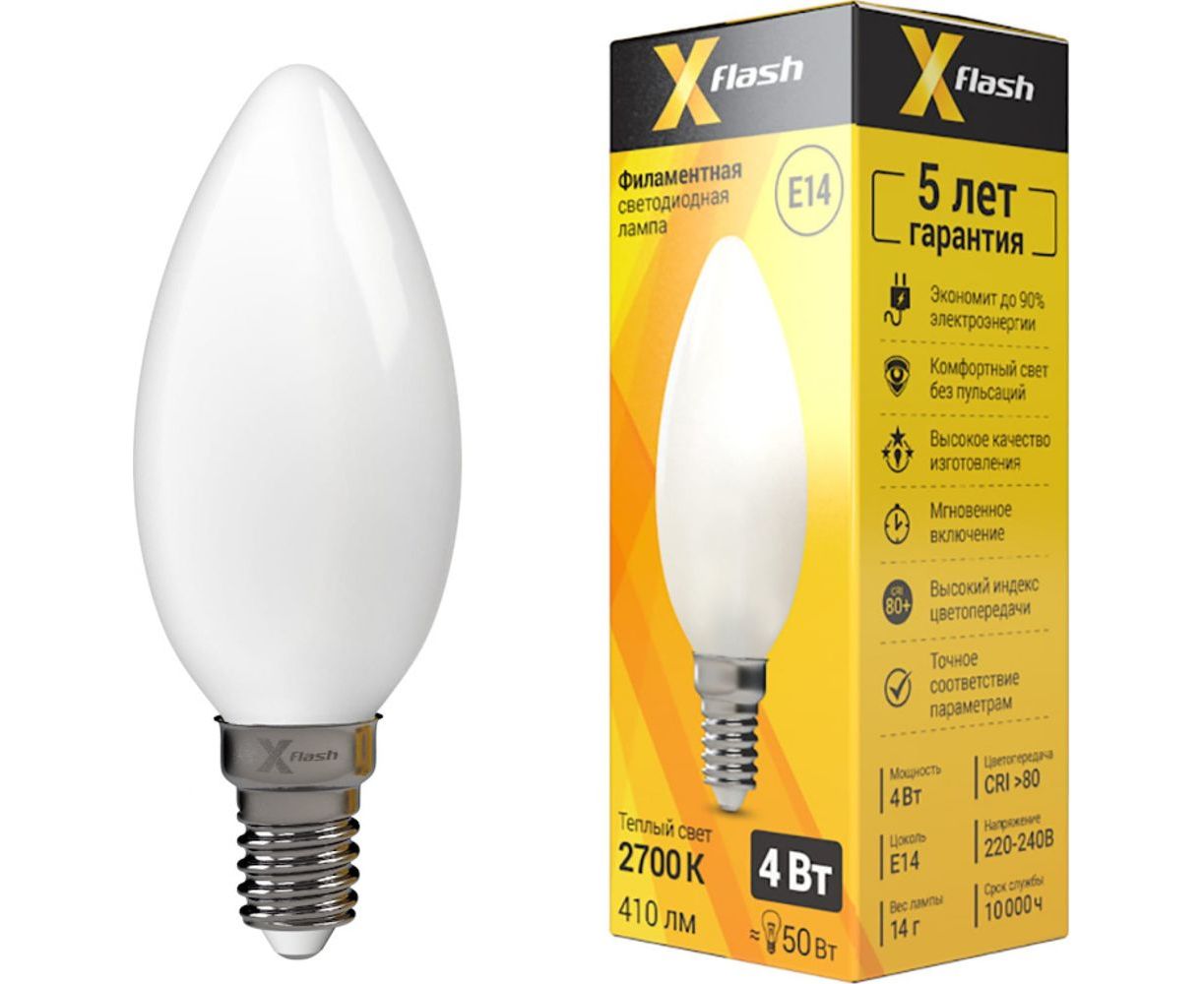 Светодиодная лампочка X-Flash XF-E14-FLM-C35-4W-2700K-230V, артикул 48496 излучает теплый свет, угол засветки - 360 градусов.