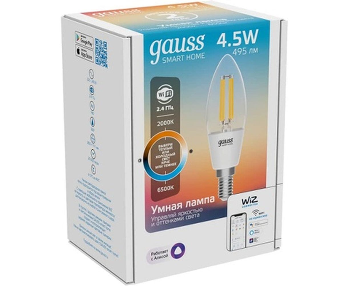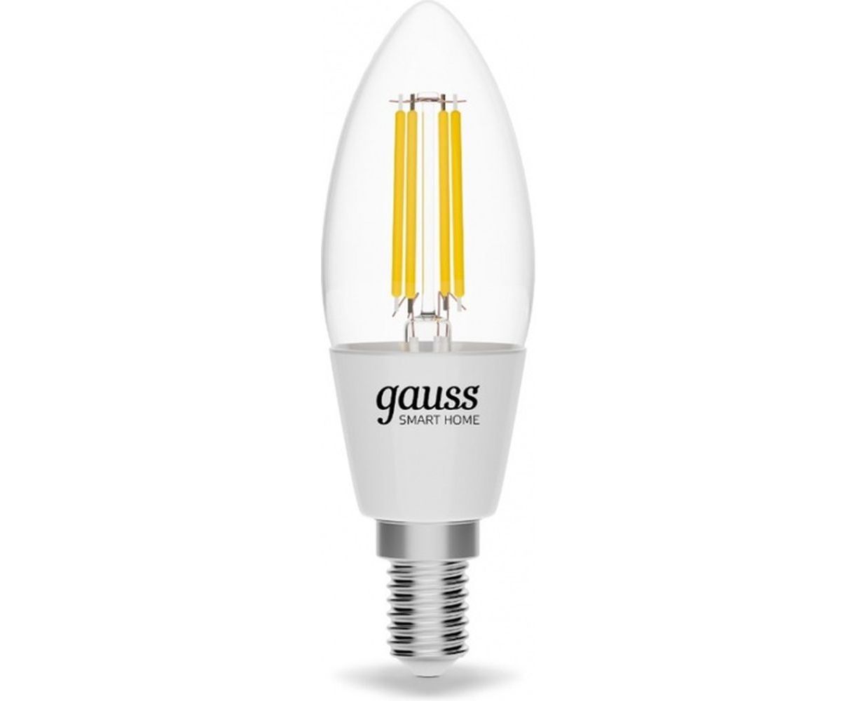 Умная Wi-fi филаментная лампочка Gauss, Smart Light ССТ DIM E14 C37 4,5 Вт 2700-6500K, диммируемая с изменением температуры, управление голосом/смартфоном 1250112