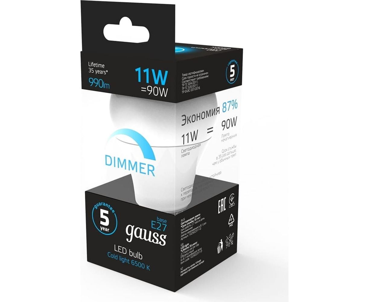 Диммируемая лампа Gauss A60 11W 990lm 6500К E27 LED 1/10/50