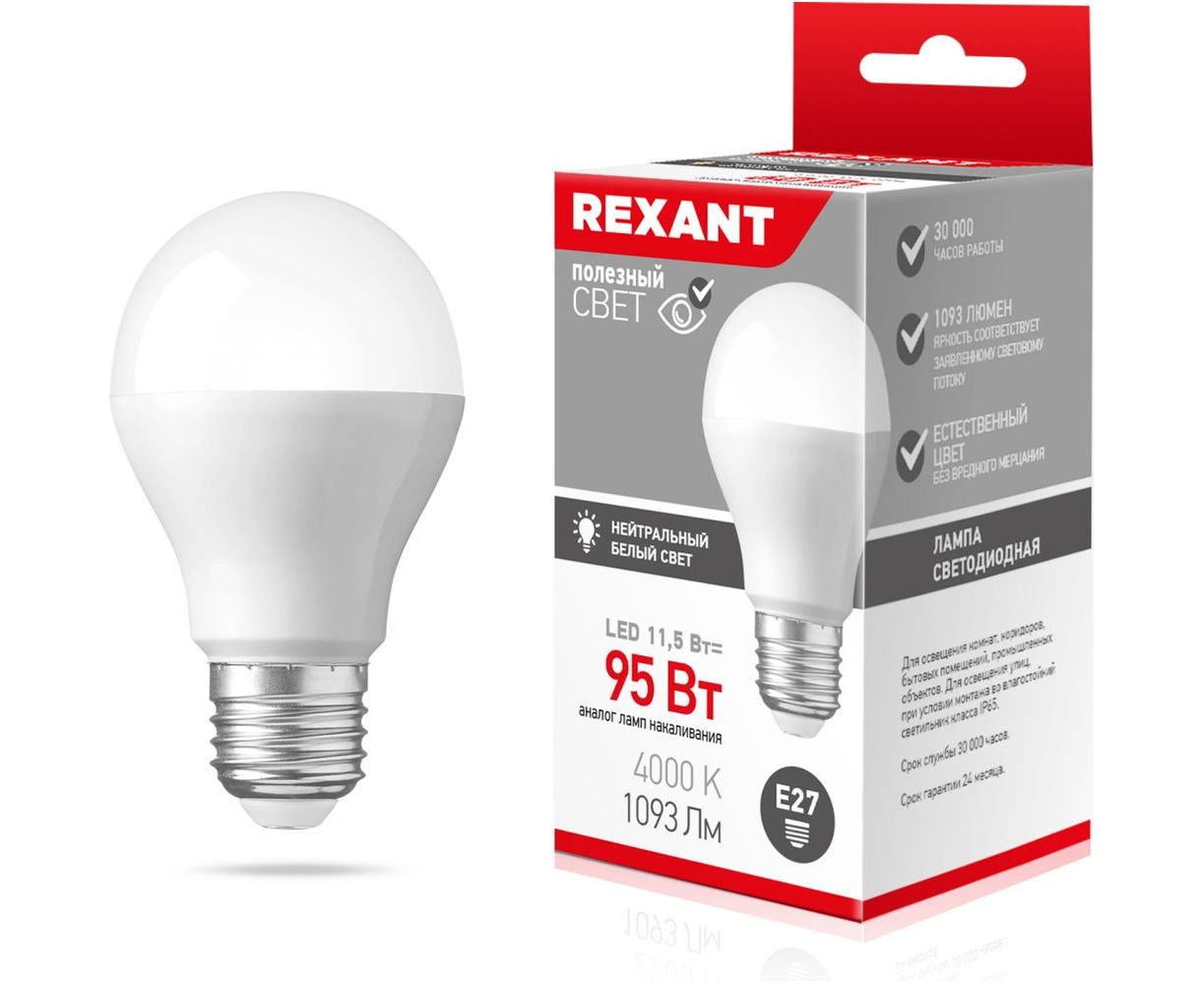 Светодиодная лампа REXANT груша, A60, 11,5 Вт, E27, 1093 лм, 4000 K, нейтральный свет 604-004