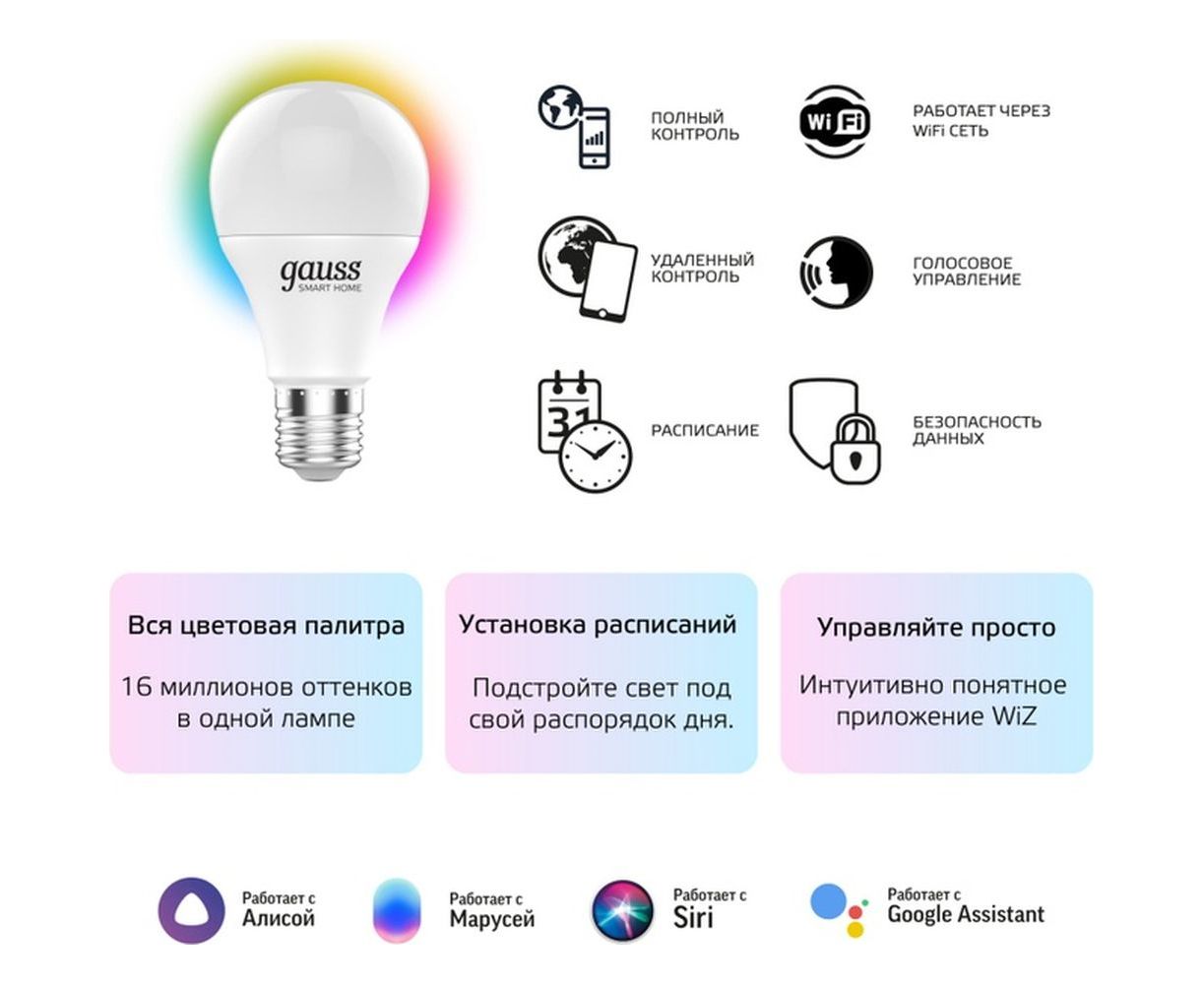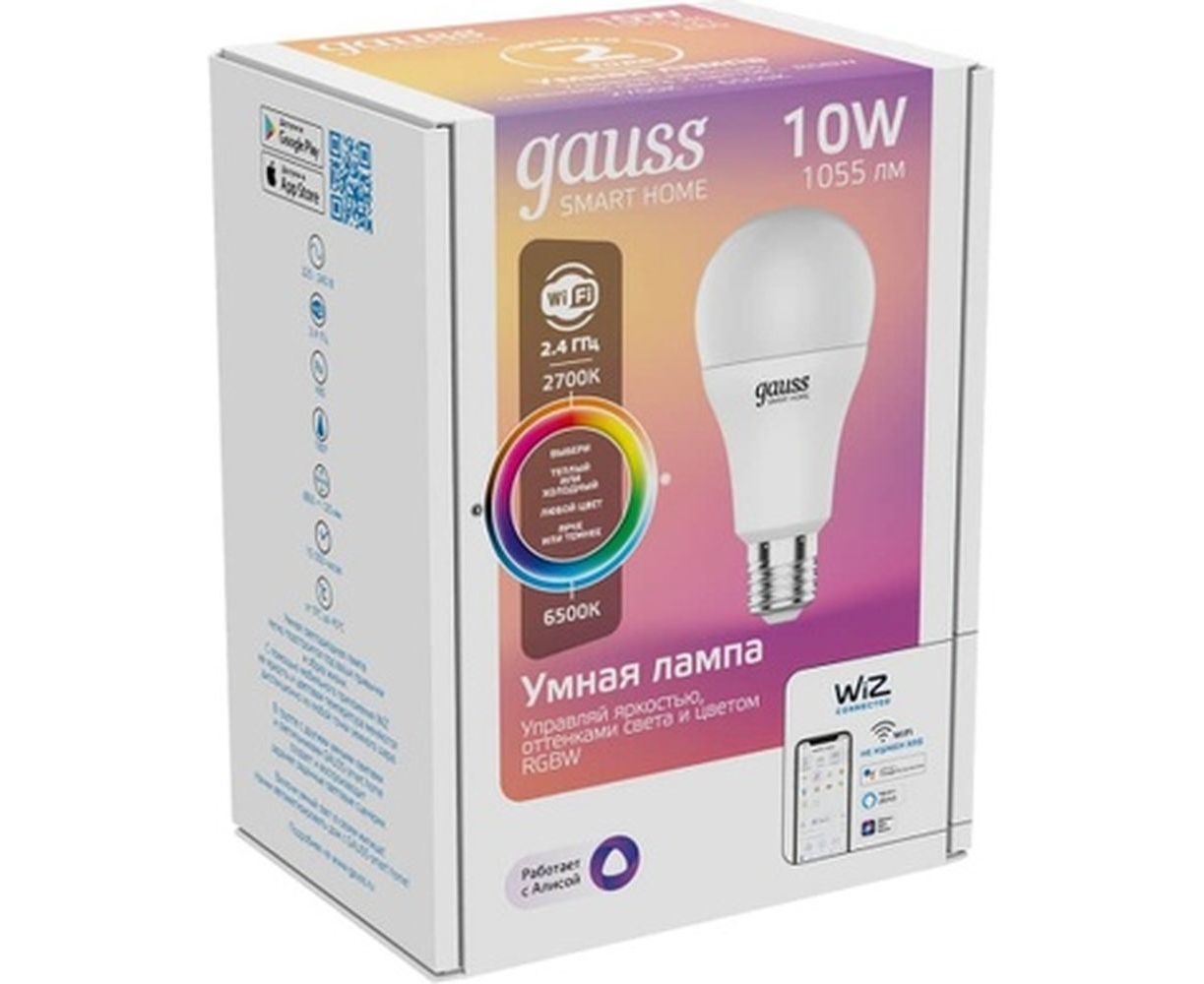 Умная Wi-fi лампочка Gauss, Smart Light RGBW E27 A60 10 Вт 2700-6500K, с изменением цвета, управление голосом/смартфоном 1180112