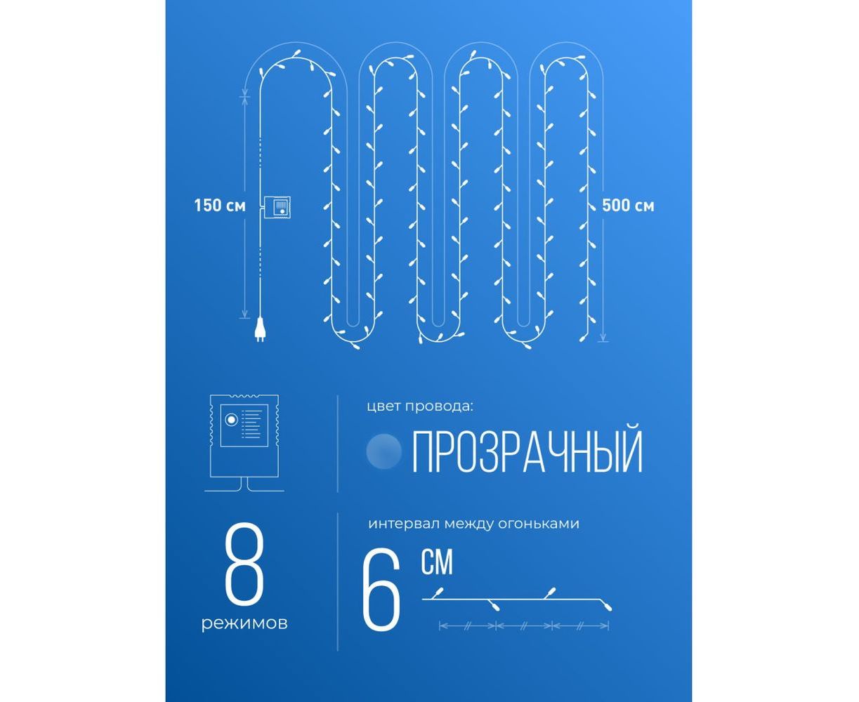 100 разноцветных светодиодов изменяют свечение с помощью контроллера, который выбирает один из режимов мигания: постоянное свечение, мерцание, медленное затухание, вспышка, мягкое свечение, последовательное включение, волна, комбинированное.