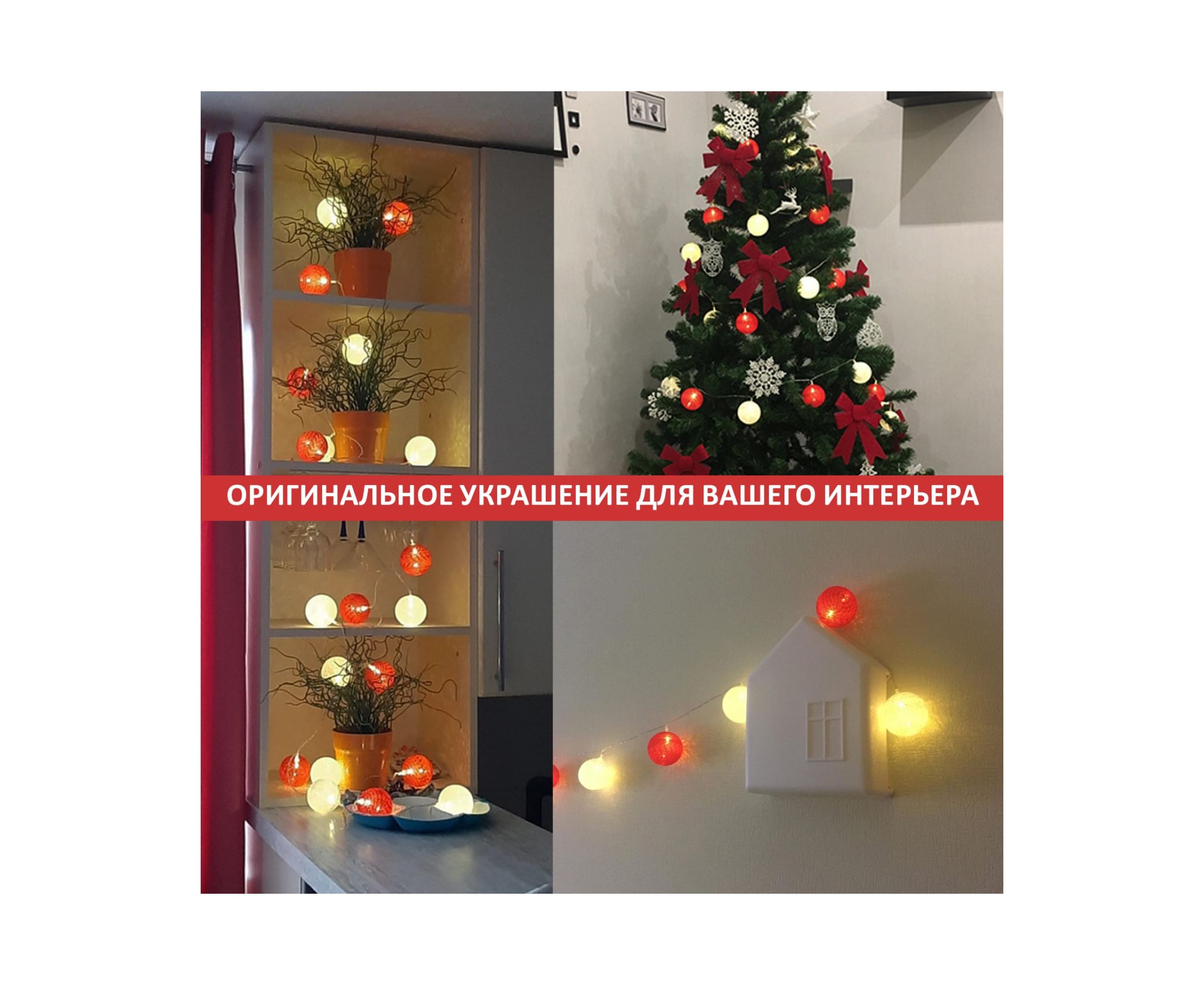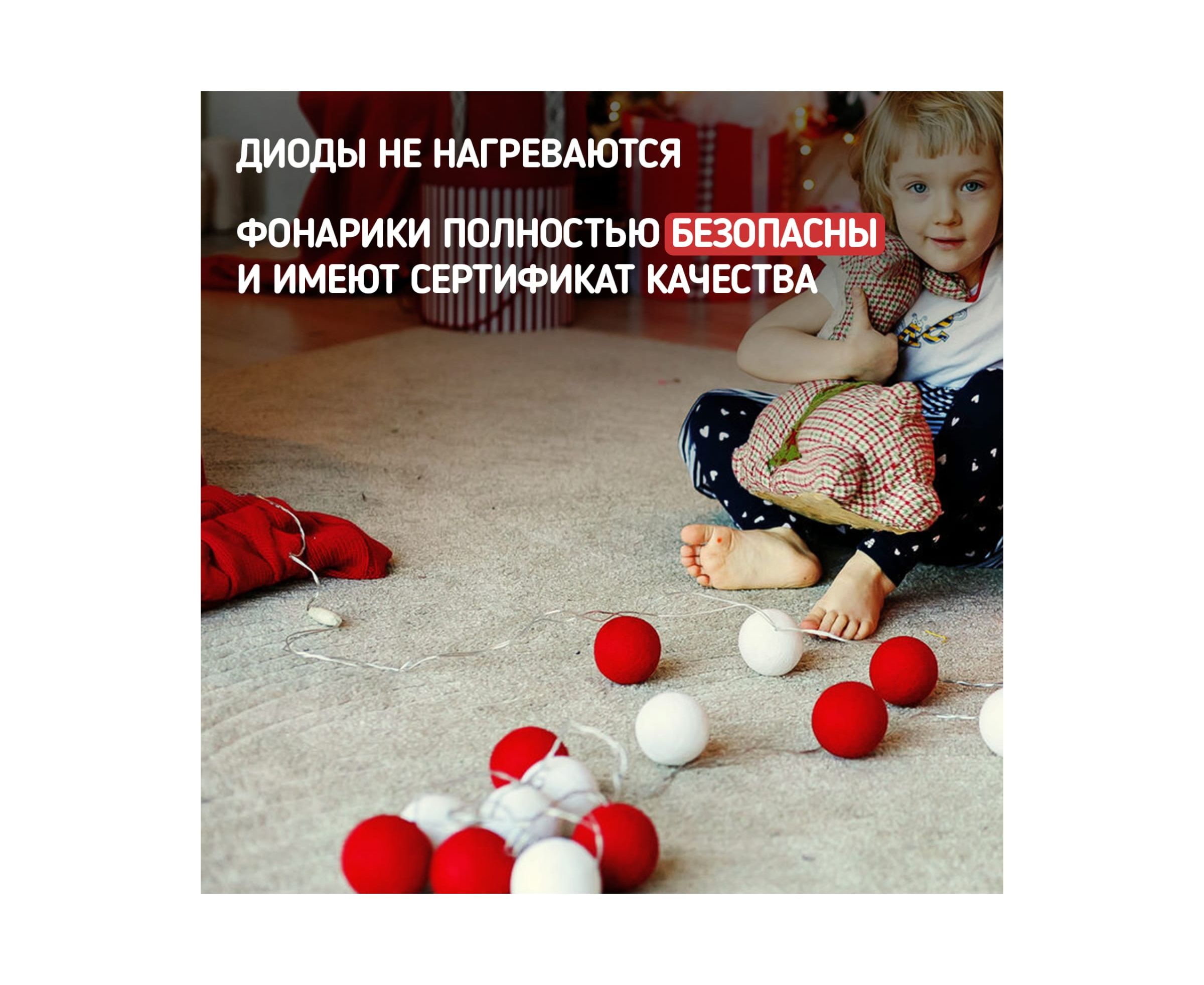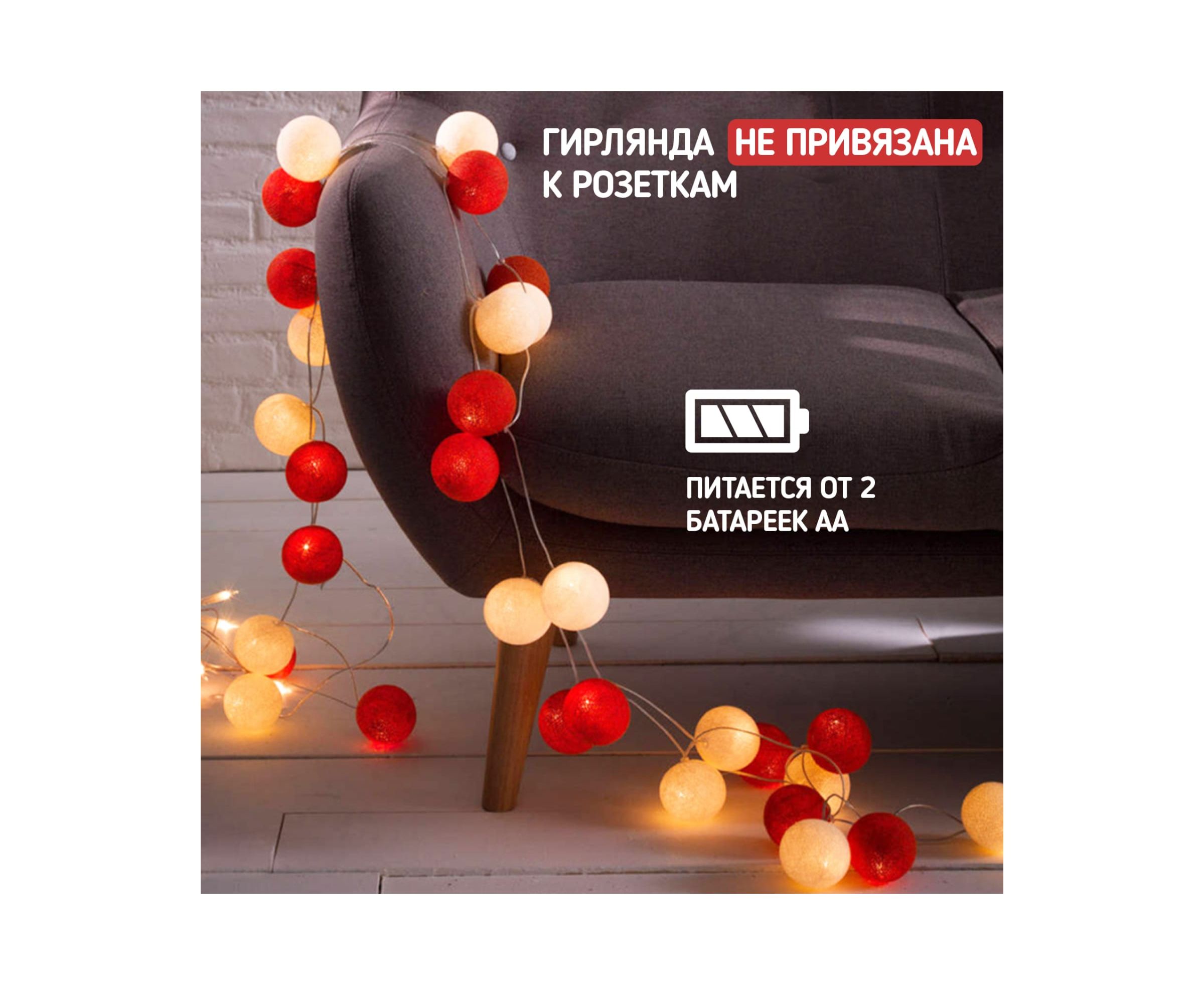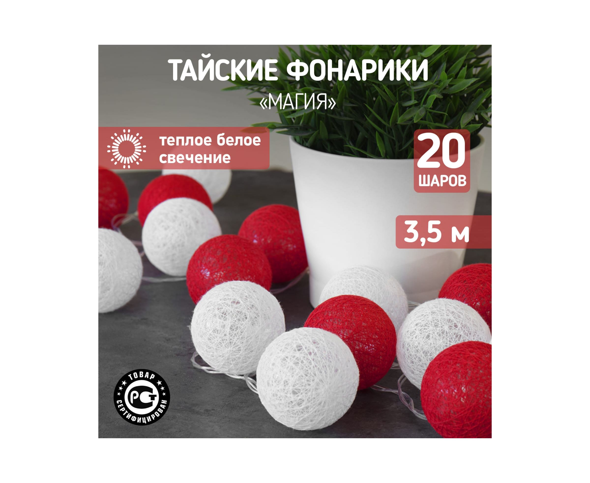 Светодиодная гирлянда-шарики NEON-NIGHT Магия 3.5м 20 LED, прозрачный провод, тёплый-белый 303-088 — это волшебная светодиодная гирлянда, которая гармонично украсит интерьер и внесет нотку восточного уюта в ваш дом. 20 текстильных фонариков красного и белого цветов, выполненных из хлопковой нити, мягко подсвечиваются яркими диодами и создают поистине магическую атмосферу. Гирлянда питается от двух батареек АА, поэтому может использоваться в декоре любых, в том числе мобильных объектов, а также для оформления детских комнат. Степень защиты IP20 подразумевает размещение в интерьере в сухих отапливаемых помещениях.