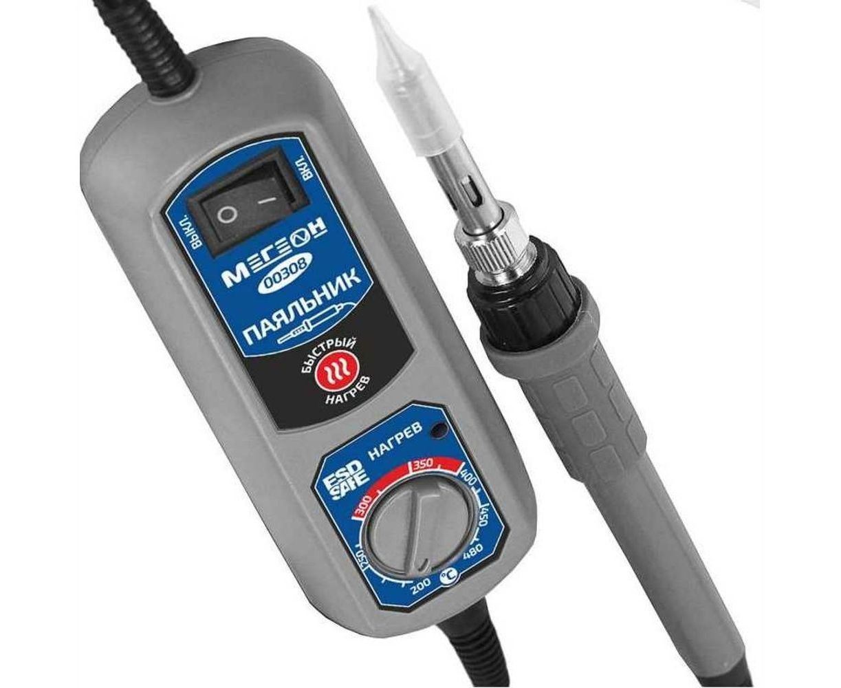 Паяльная станция МЕГЕОН 00308 предназначена для лужения и пайки. Специальная схема позволяет устанавливать температуру нагрева в диапазоне от 200 до 480°. Паяльник имеет устойчивую к нагреву рукоятку. Между рукояткой и жалом есть изолирующее кольцо для безопасного использования инструмента.