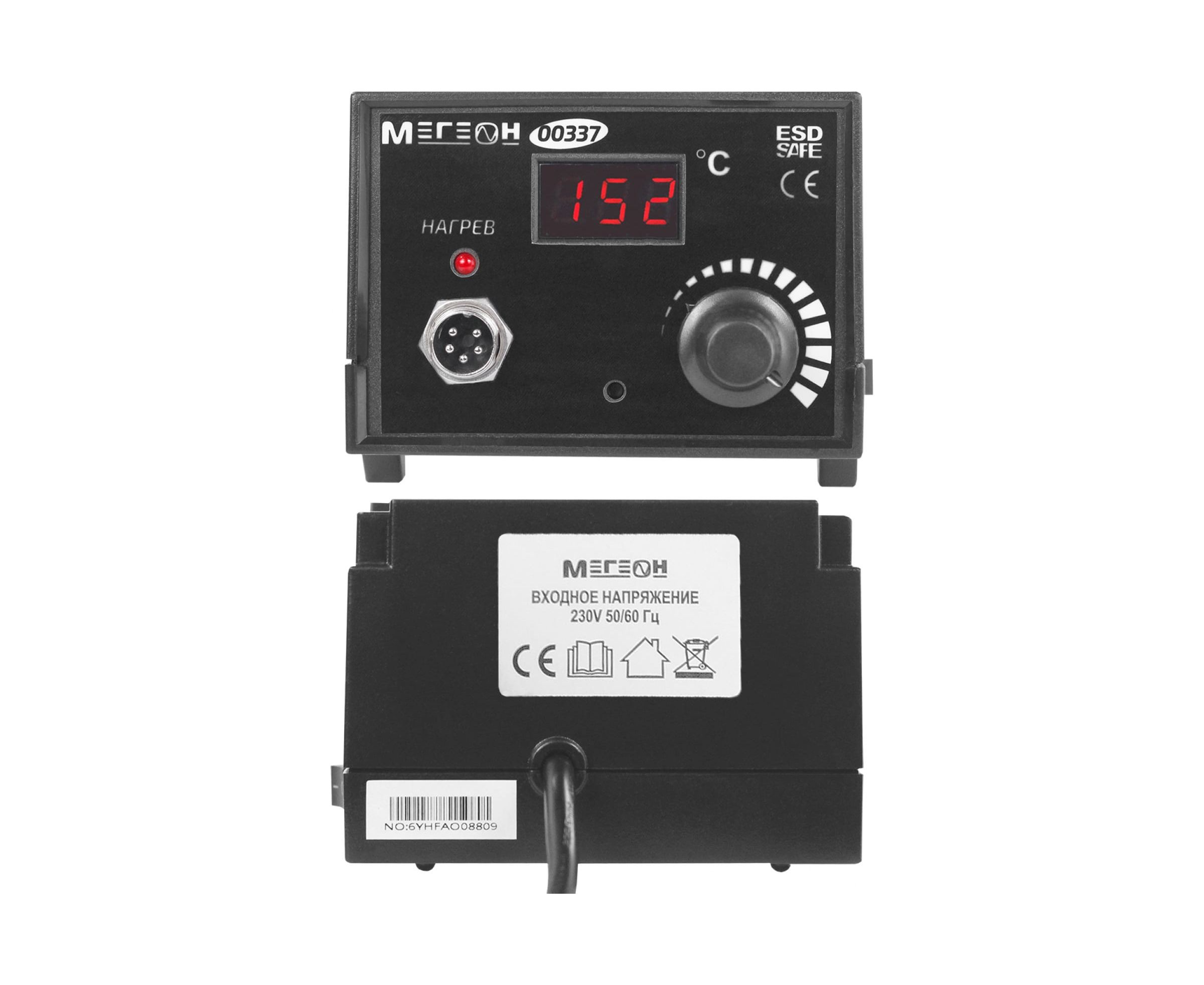 Паяльная станция МЕГЕОН 00337 – это удобный паяльник увеличенной мощности до 75 Вт с ярким светодиодным дисплеем и аналоговым регулятором установки температуры. Немаловажным преимуществом при работе с паяльником является маленький вес, мягкий провод и компактные размеры блока управления. На рукоятке предусмотрена резиновая наклдака противоскольжения. Жало паяльника имеет распространённый типоразмер 900М-Т. Благодаря этому имеется большое количество сменных наконечников разной формы и размеров (в комплект не входят) для осуществления специфической пайки. В дополнение к написанному можно добавить ещё одно преимущество и это автоматическое поддержание установленной температуры паяльника. Для исключения повреждения радиокомпонентов статическим электричеством станция имеет фунцию антистатической защиты. Прибор по достоинству оценят профессионалы и любители.
