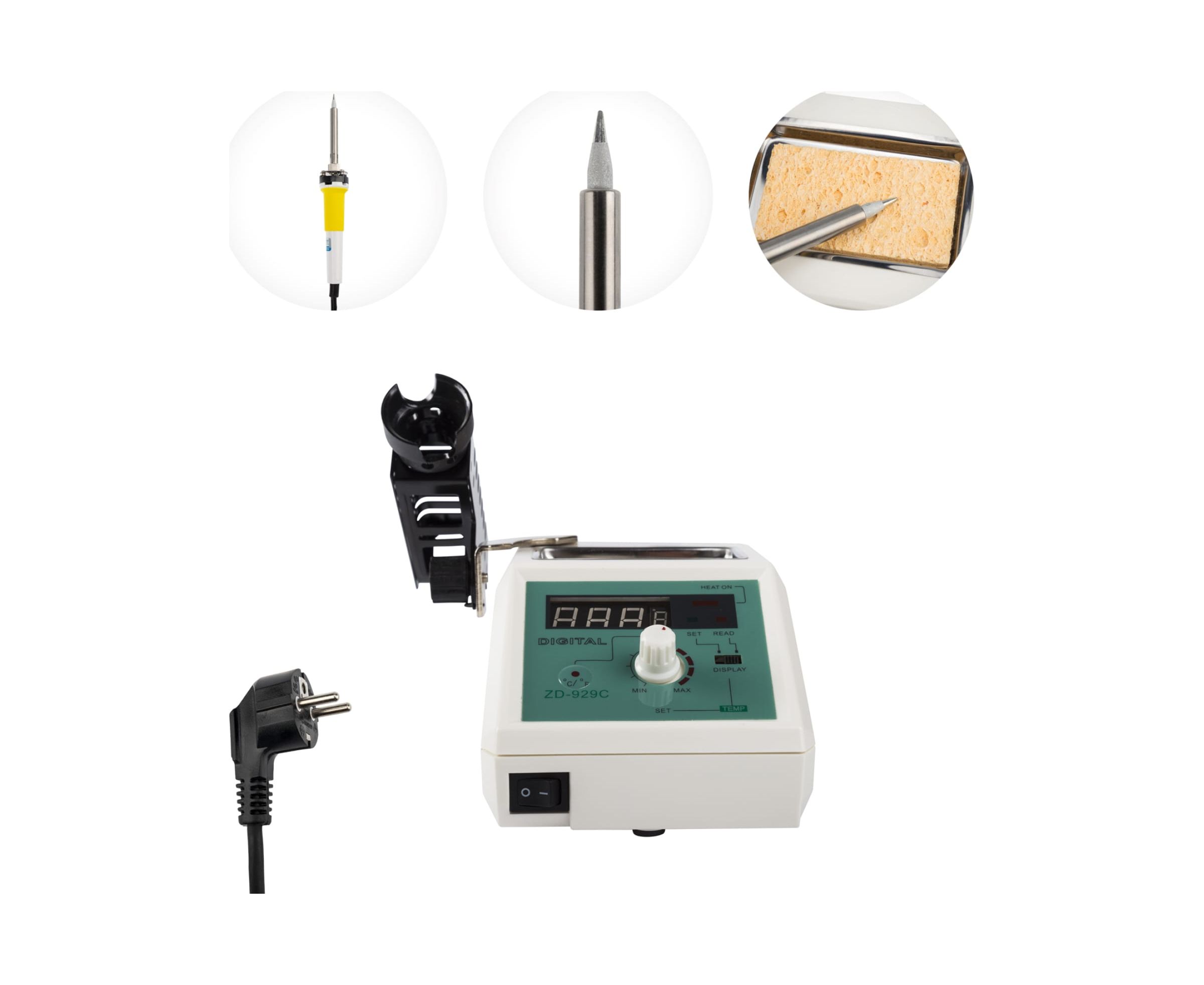Паяльная станция с разрывом и дисплеем 150-480С 220В 48Вт REXANT ZD-929C JTL-01 12-0155 обеспечивает легкость и удобство ручного выполнения работ по монтажу радиоэлементов. Данную модель устройства можно использовать как в домашних условиях, так и в профессиональной сфере. Микропроцессорное управление обеспечивает высокую точность настройки температурного режима (с точностью 2-3°С) расплавленного припоя вне зависимости от напряжения электросети. Питание паяльника осуществляется от понижающего трансформатора, что гальванически развязывает его от первичной сети. В комплекте к станции поставляется паяльник с керамическим нагревательным элементом, держатель, губка для очистки жала.