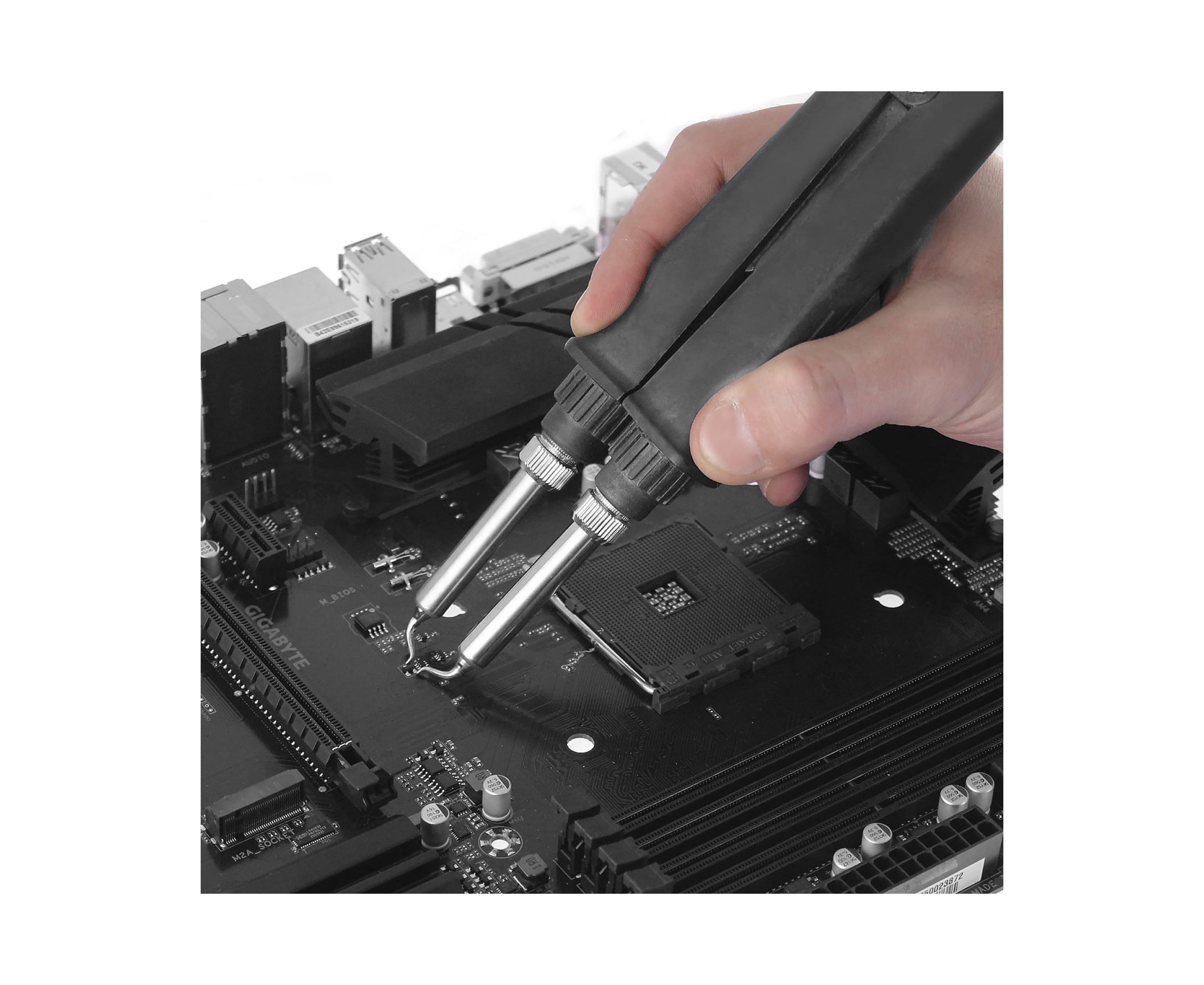 Монтажный термопинцет МЕГЕОН 00722 предназначен для аккуратной работы с малыми электронными SMD компонентами и печатными платами, имеющими большое количество элементов, где использование обычного термопистолета может расплавить и повредить их. Наличие двух керамических нагревательных элементов позволяют термопинцету быстро и равномерно прогреваться. Бесступенчатая система регулировки температуры (с возможностью калибровки) позволяет проводить монтажно-демонтажные операции с компонентами различного размера и сплава. Данная модель нагревательного прибора широко распространена для эксплуатации в лабораториях, на производственных предприятиях, в мастерских по ремонту компьютерной техники и мобильных устройств, а также другого различного электронного оборудования.