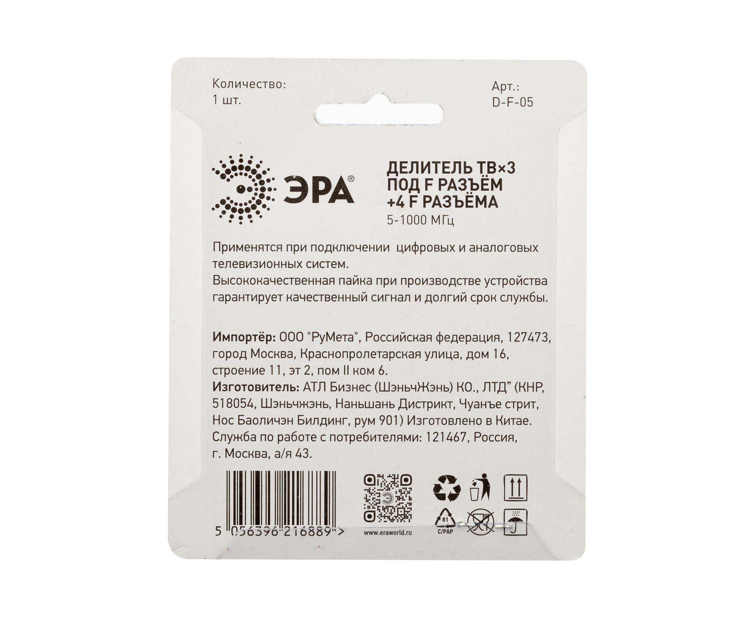 Дополнительные технические характеристики делителя ЭРА ТВ DF05 3 ответвления под F разъем, в комплекте 4 F разъема, 5-1000 МГц Б0048324: