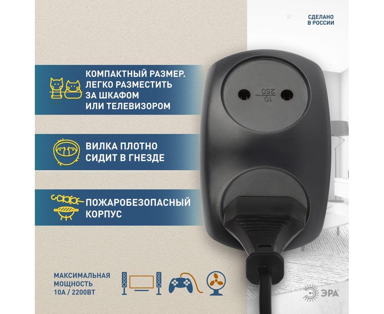 Электрический разветвитель ЭРА SPx-2-B на 2 розетки, без заземления, 10А, черный Б0059720