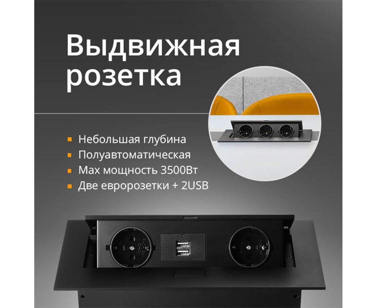 Выдвижной встраиваемый полуавтоматический блок розеток Mebax 226 чёрного цвета на 2 розетки и 2 usb – эргономичное решение для рабочего стола, кухонной столешницы и других поверхностей. Снаружи корпус выполнен из цинкового сплава, нижняя часть – из стали. Размеры выезжающей панели: 212 х 60 мм.