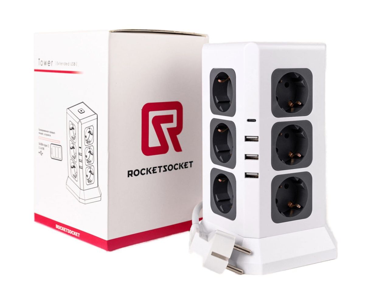 Удлинитель RocketSocket Tower Extended 12 Euro 16A, 4 USB 3A+C с блоком 5В/3.4А, кабель 2,0 м, цвет белый-серый оснащен 4-я мощными портами USB (3 A), что позволяет заряжать два устройства одновременно, в том числе планшетные компьютеры и смартфоны. Время зарядки будет меньше чем при использовании USB порта на вашем ноутбуке.