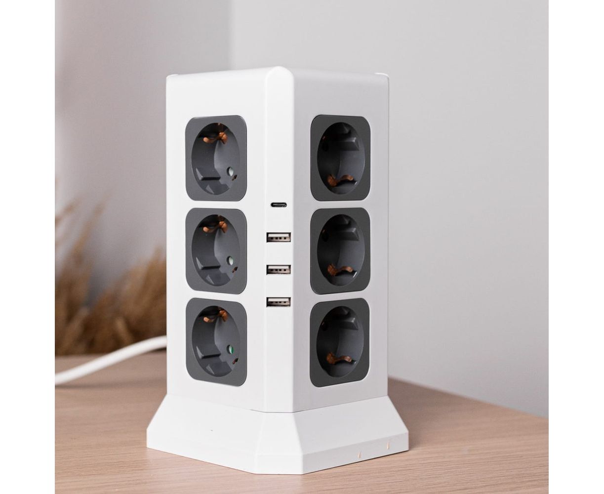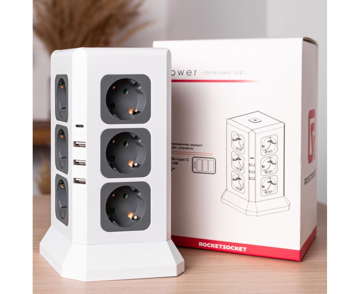 Удлинитель ROCKETSOCKET Tower Extended 12 Euro 16A, 4 USB 3A+C с блоком 5В/3.4А, кабель 2,0 м цвет белый GNS5004 предлагает решить проблему создания дополнительных розеток в любом необходимом месте.