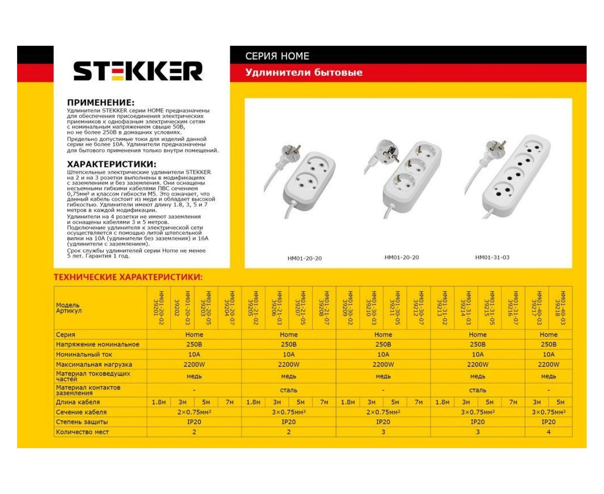 Удлинитель STEKKER штепсельный 4 гнезда б/з 2x0,75 белый 5м HM01-40-05, Ух-10 39218