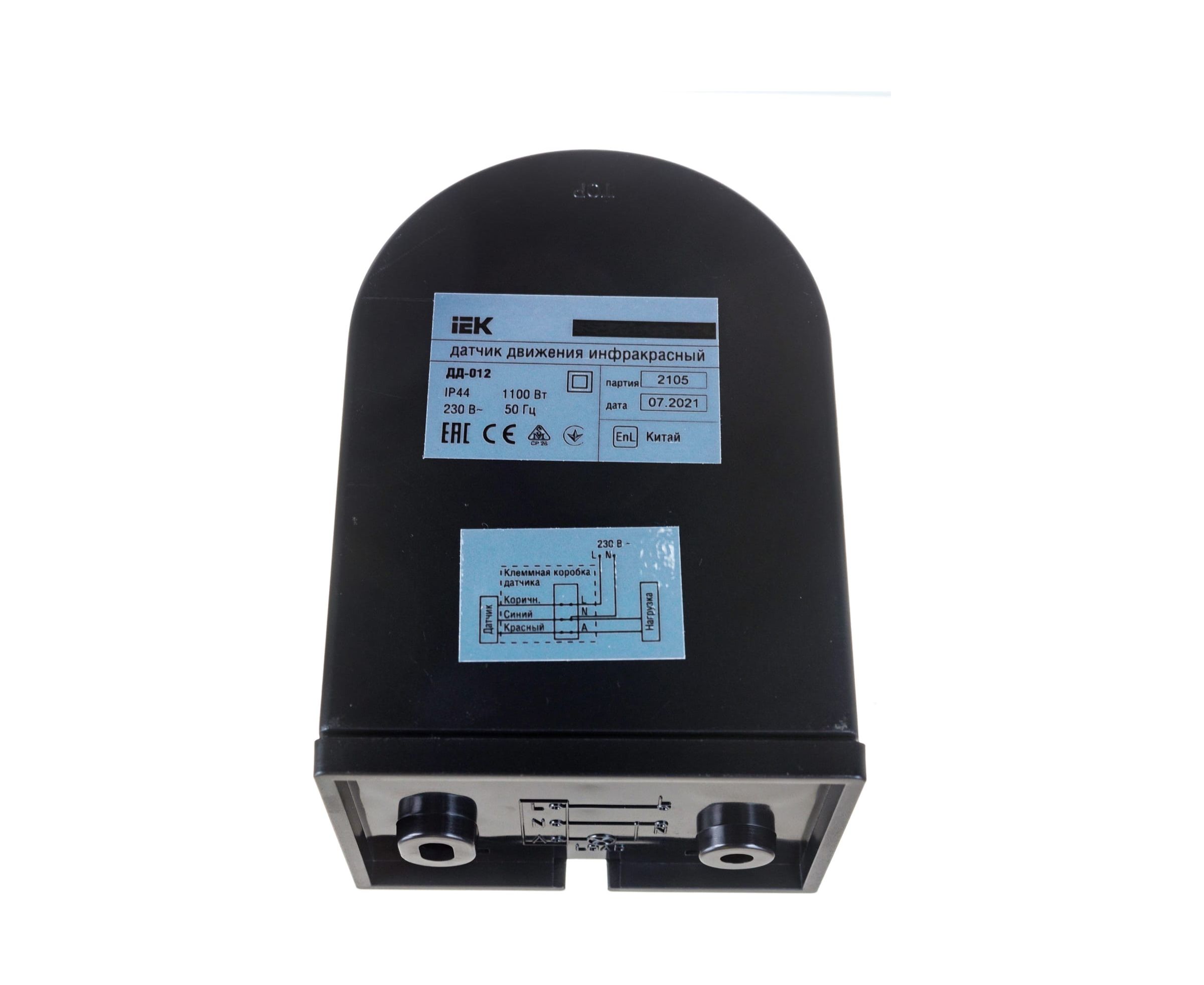 Детектор движения IEK ДД 012 1100Вт угол обз. 180град., дальн. 12м, IP44, черн. LDD10-012-1100-002 предназначен для подачи нагрузки при обнаружении движения.