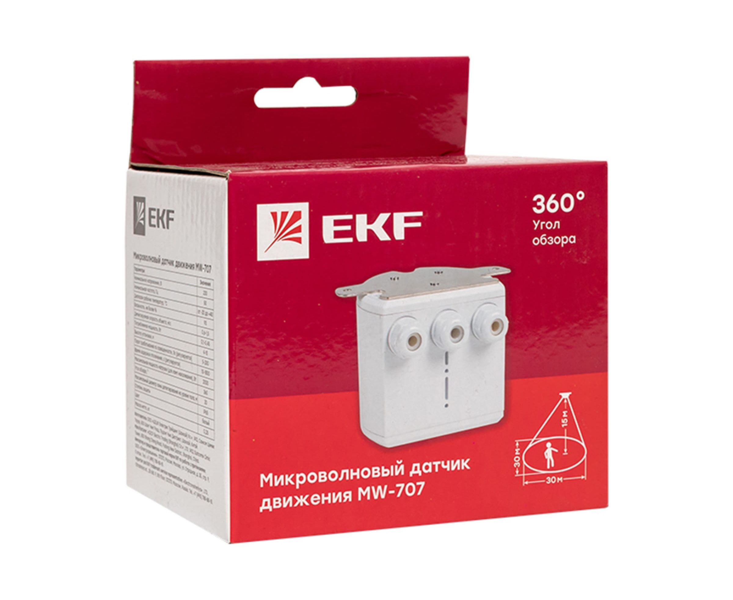 Микроволновый датчик движения EKF MW-707 2000Вт, IP65 dd-mw-707 для помещений с высокими потолками имеет универсальную конструкцию и может устанавливаться на стену, на потолок или в корпус светильника. Датчик можно устанавливать на улице. При фиксации движения датчик коммутирует подключенную нагрузку (до 1200Вт). И автоматически выключается, если движение прекращается (время настраивается в диапазоне от 10 секунд до 15 минут). Уличный датчик движения имеет функцию контроля освещенности. Если освещенность в зоне детекции выше заданного уровня, то датчик движения не реагирует и экономит электроэнергию в дневное время.