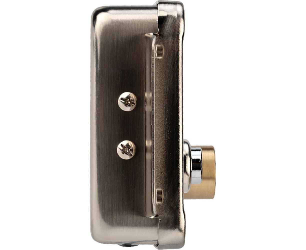 - Корпус замка: железо никелированное, двойной соединенный латунный цилиндр с кнопкой, латунная защелка и защелка с крышкой.