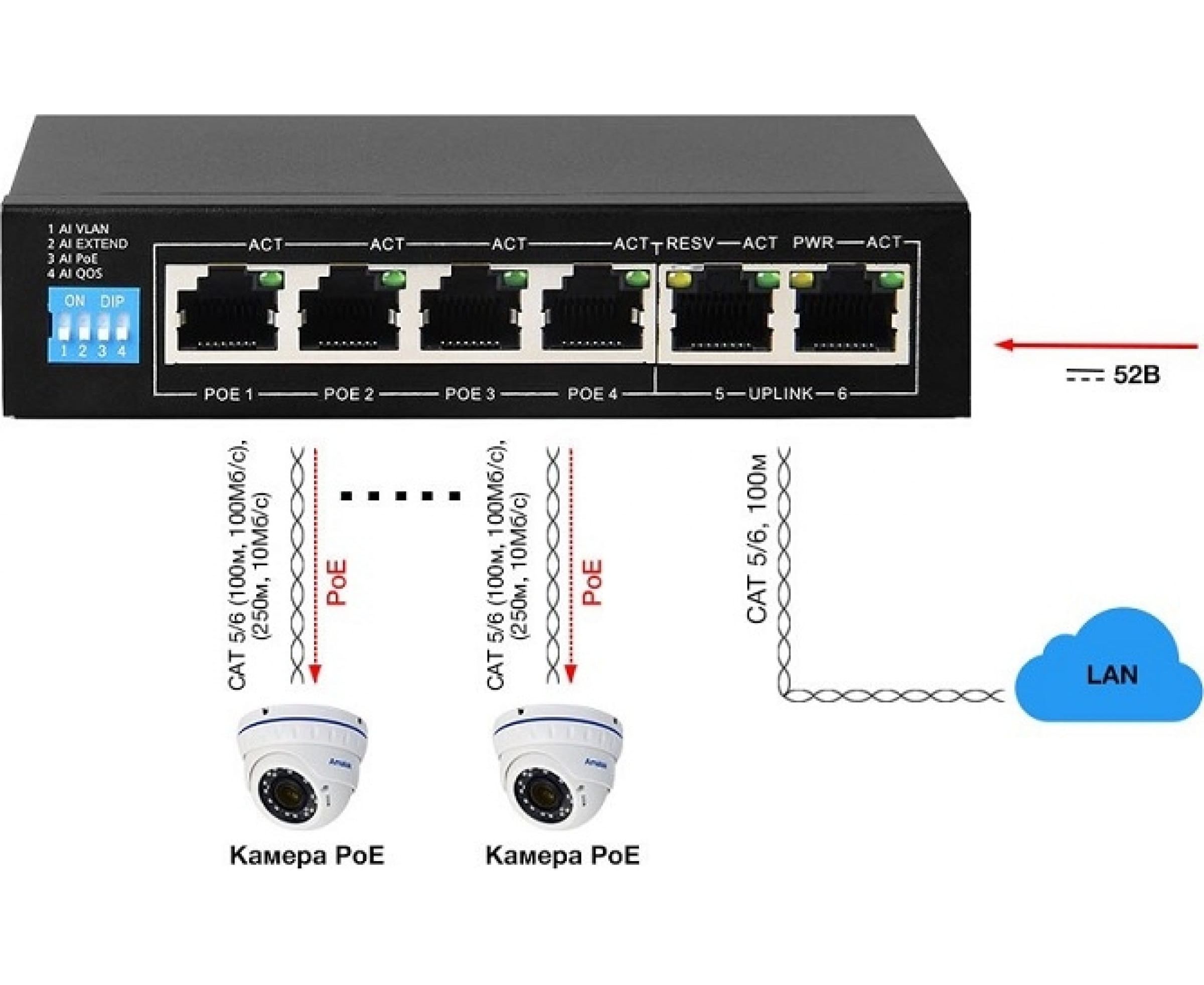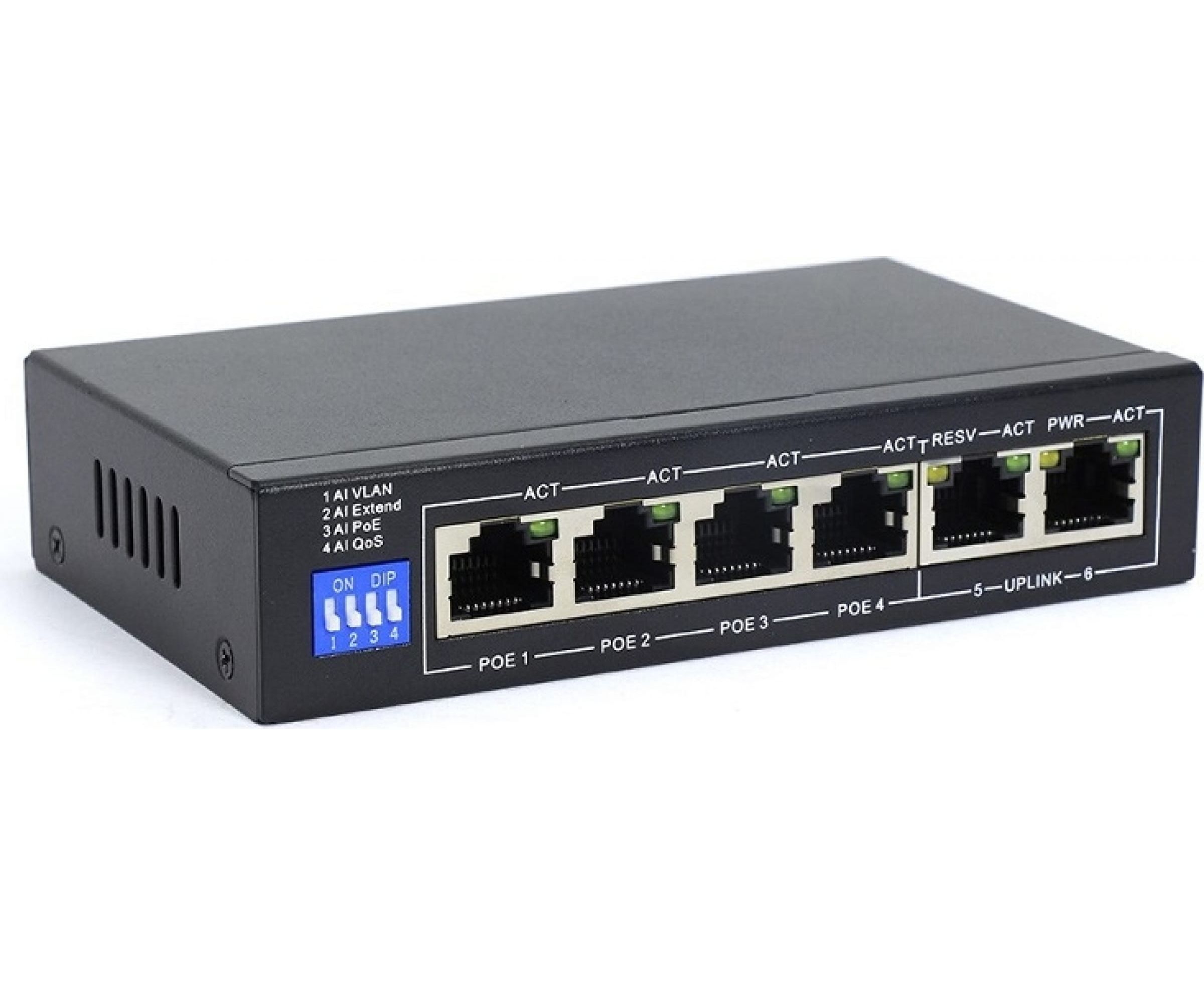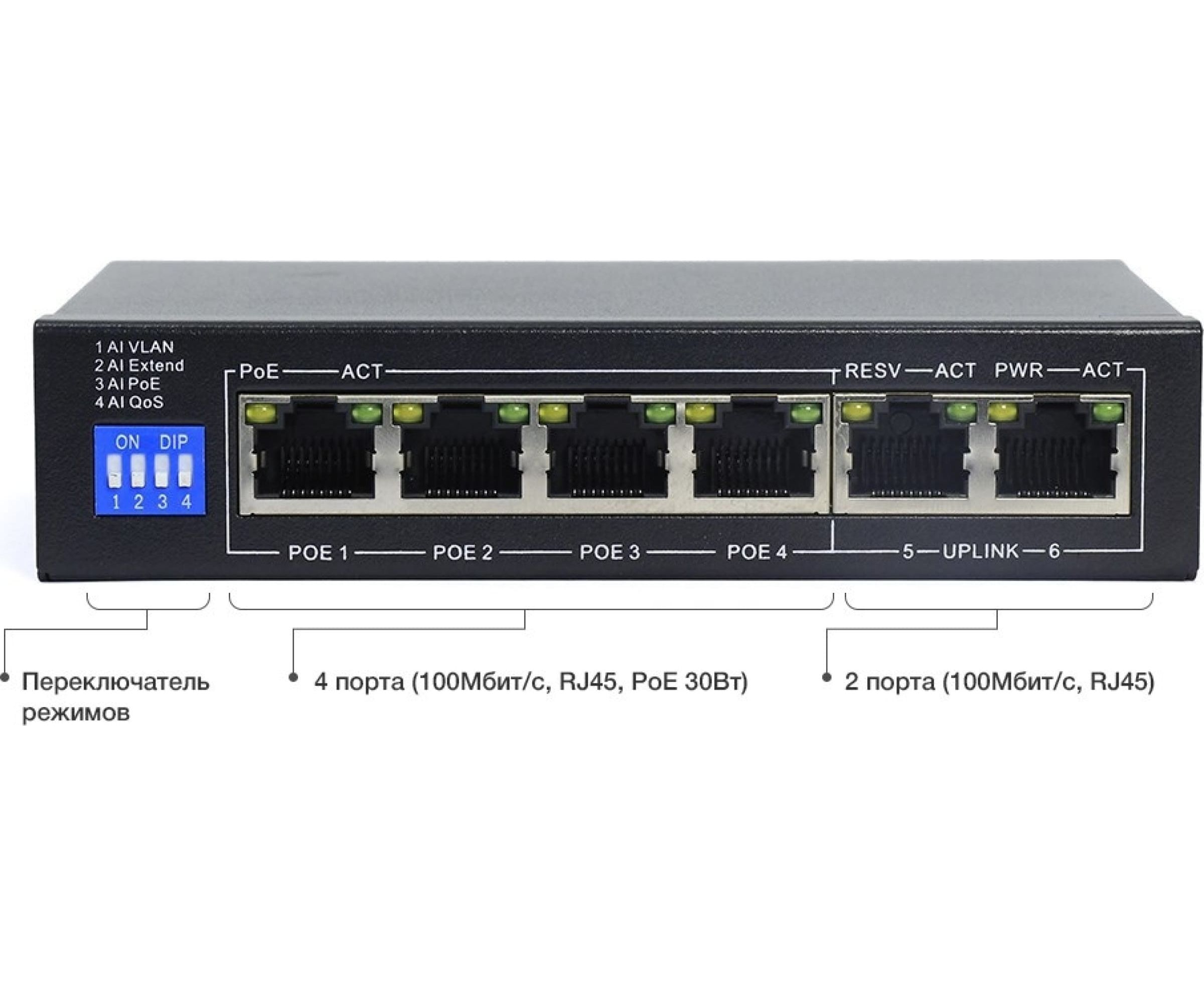 6-портовый коммутатор Amatek AN-S6P4M 100 Мбит/с с PoE+ до 60Вт 7000338