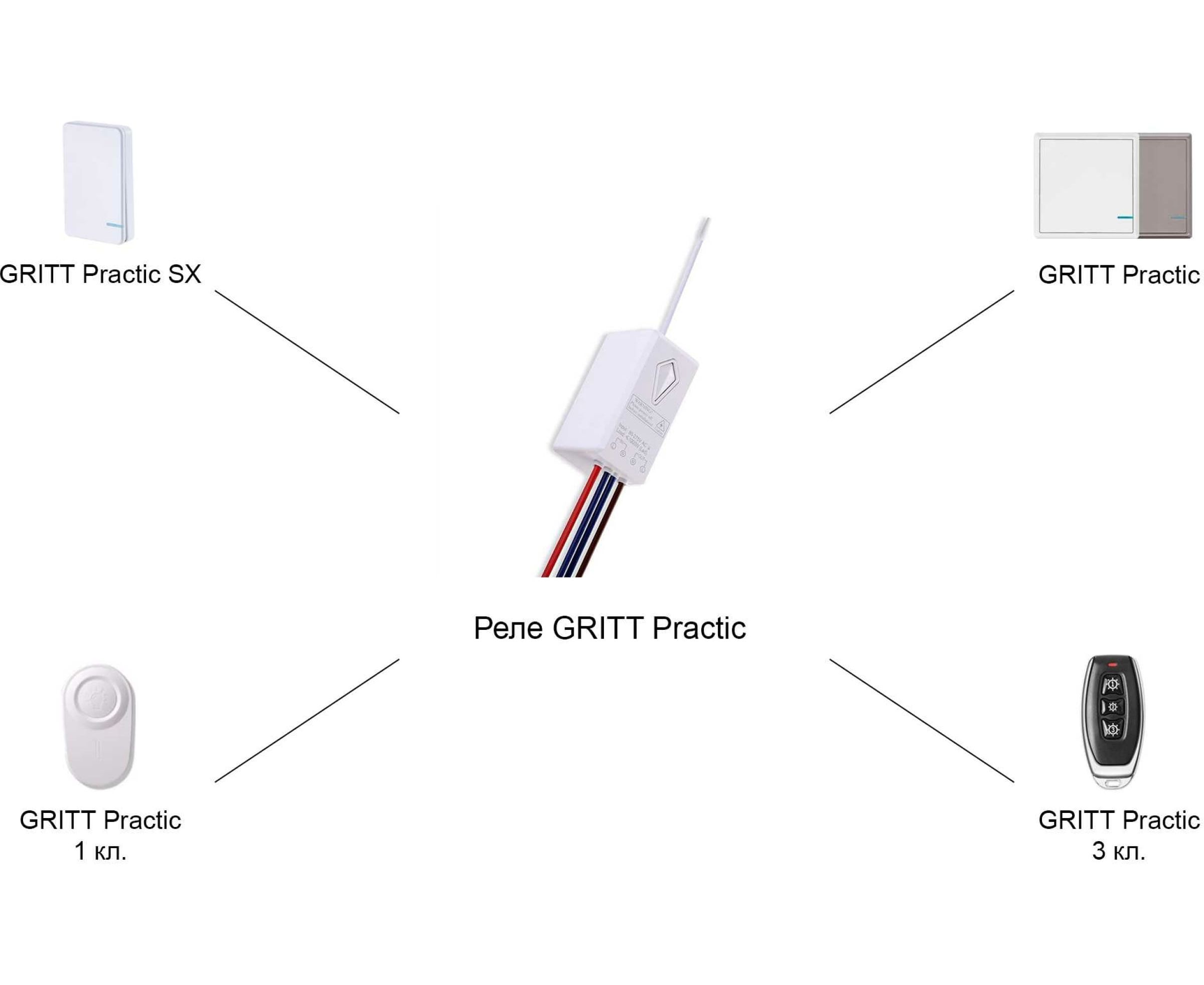 Реле GRITT Practic 1 группа 220В 5А 31001 - радиореле для удаленного включения электроприборов на 1 линию управления. Управляется беспроводными выключателями и пультами GRITT Practic.