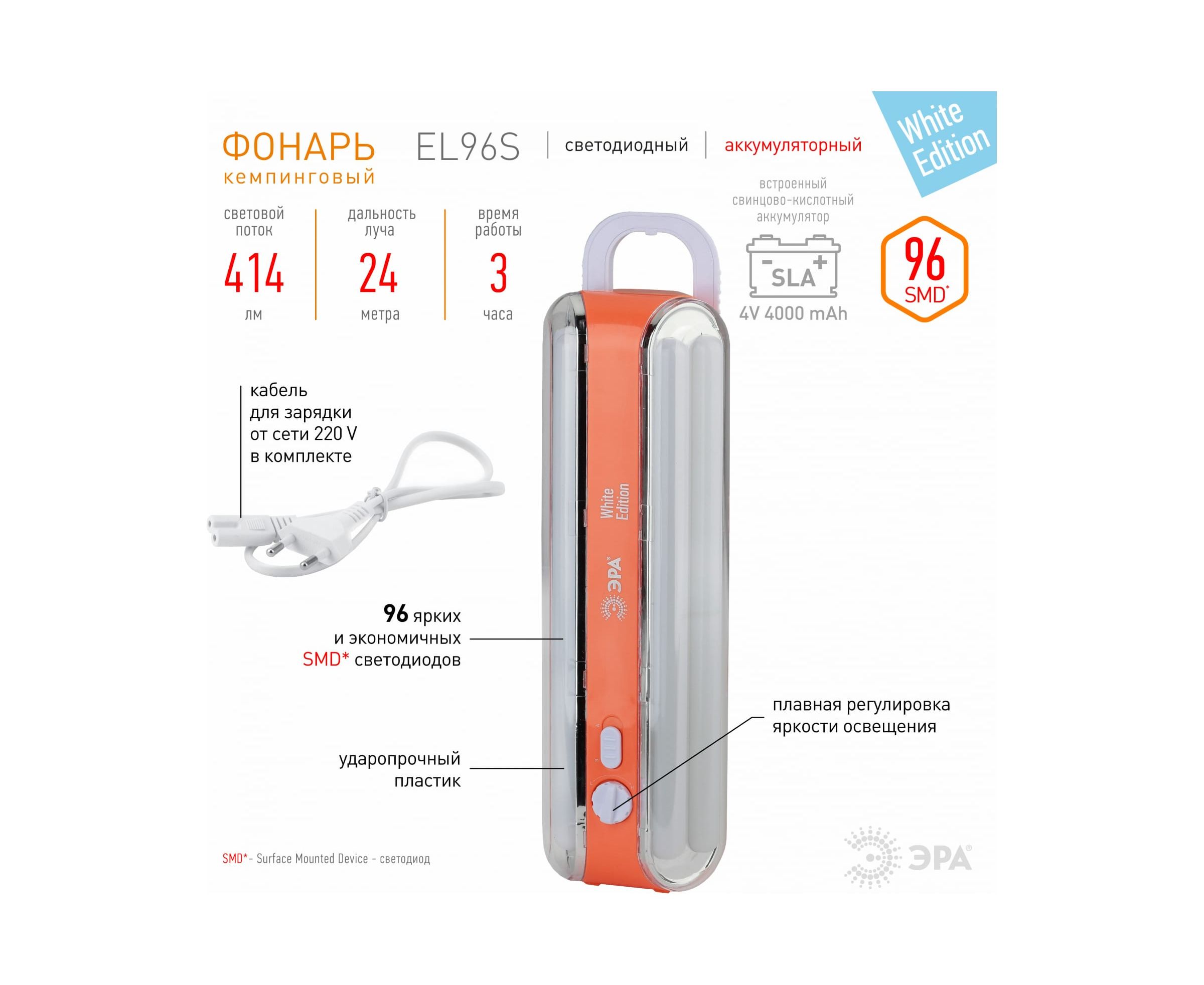 Фонарь ЭРА EL96S кку 4V4Ah, 96SMD, ЗУ 220V Б0026988 для экстренного освещения EL96S - светит с максимально возможной яркостью. Количество светодиодов в фонаре 96, 4 колбы: в каждой - по 24 диода. Для максимального освещения можно включить все колбы сразу, а для экономного освещения - две. Регулируется яркость освещения плавным диммером. Фонарь оборудован светодиодами нового поколения (SMD), такие светодиоды ярче стандартных на 50%, а цветовая температура более естественная, фонарь светит белым светом без синевы. Дальность луча составляет 24 метра, а световой поток - 414 Лм.